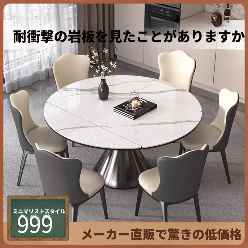多機能折りたたみ式ステンレス製岩板ダイニングテーブル&チェアセット - 丸型・角型兼用、コンパクトな家族向け、電磁調理器対応!おしゃれで便利な小型住宅向けの完璧な選択です。