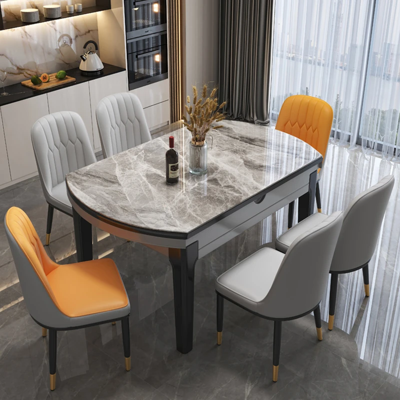 伸縮可能な複合金属ステンレス製の岩板ダイニングテーブルセット - 小型スペースに最適!四角から丸型に変形、イタリアンスタイルの電磁調理器付きで便利さとスタイリッシュさを両立!