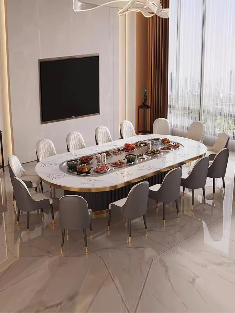 軽奢スタイルの石板ダイニングテーブル | ホテル用電動テーブル | 家庭用大円卓 | 回転式プレート付き | ヴィラ向け電磁調理器付き鍋テーブル | 快適な食事体験を提供します!