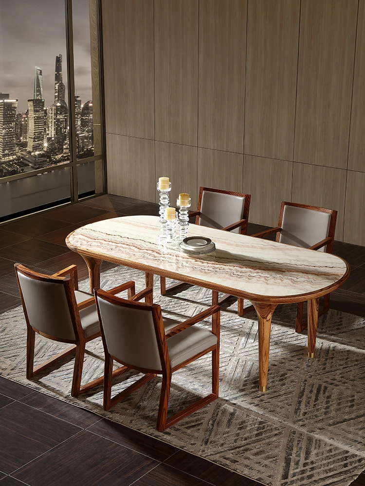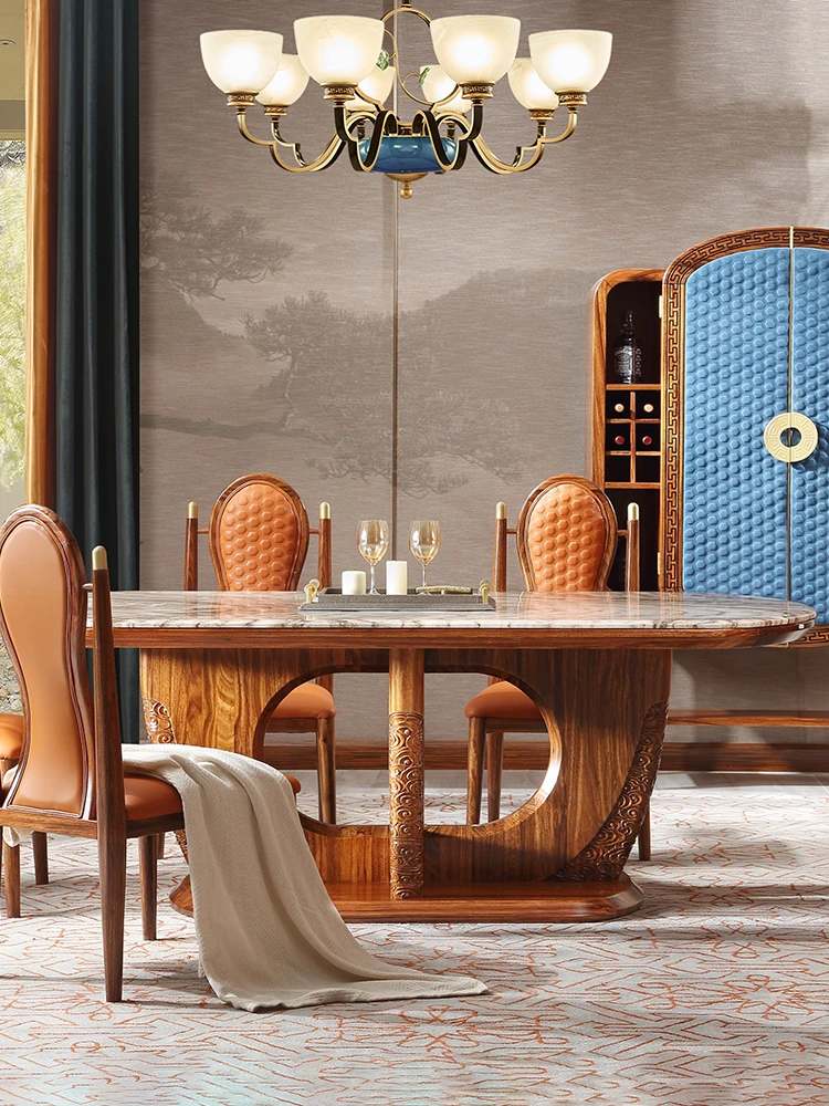Kaiser Palace New Chinese Style Oval Solid Wood Dining Table and Chair Set with Black Marble Finish - Perfect for Home Dining Experience, Elegant and Durable Design for Every Meal