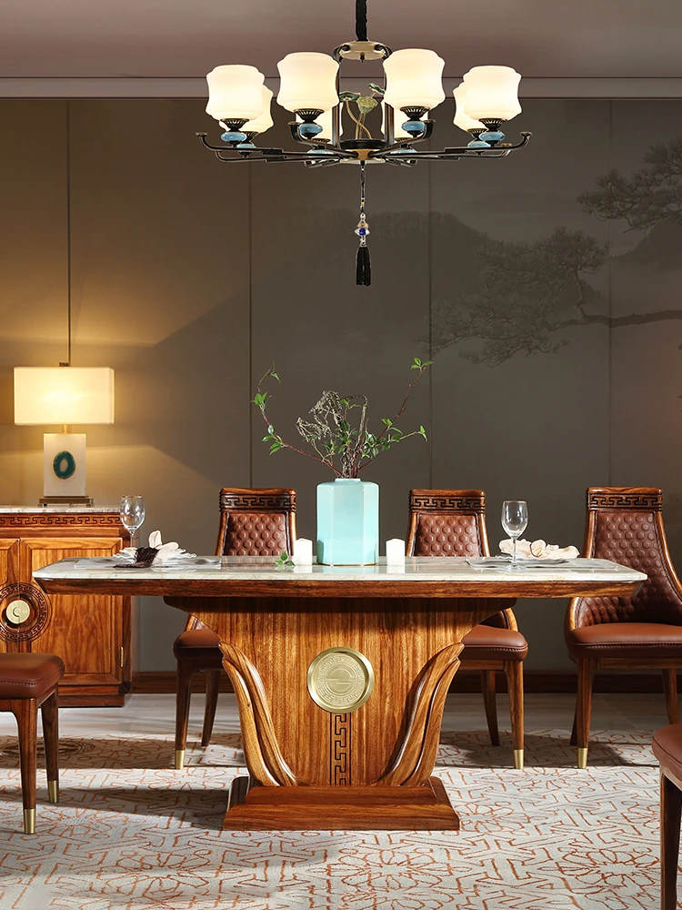 Modern Chinese Style Rectangular Marble and Solid Wood Dining Table Set - Luxury Dark Wood Dining Experience