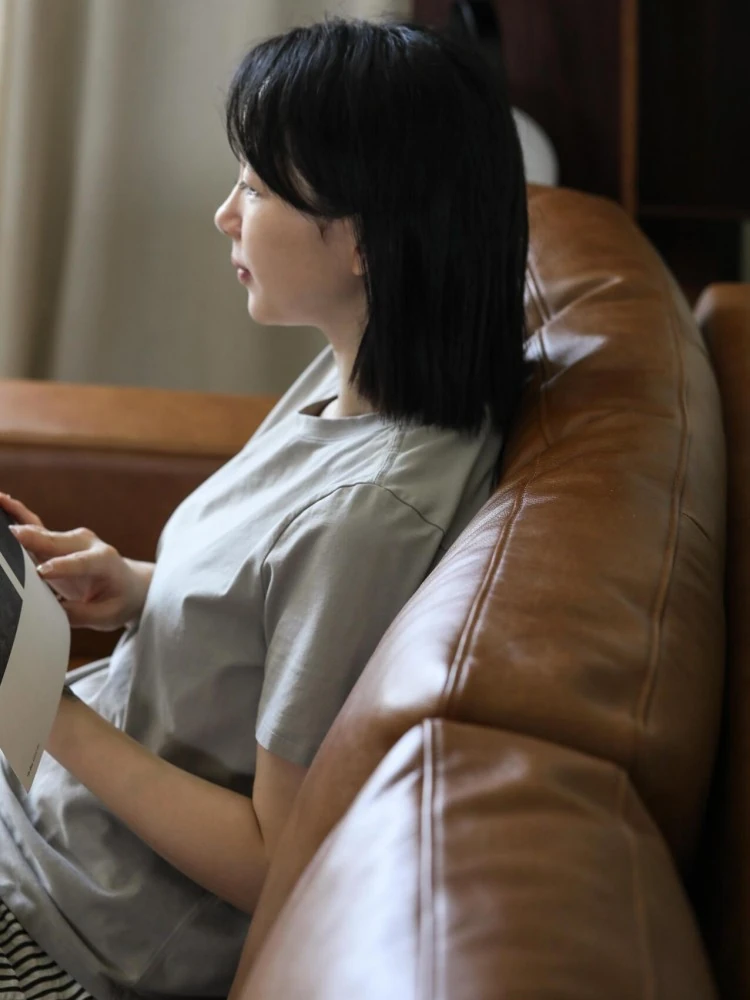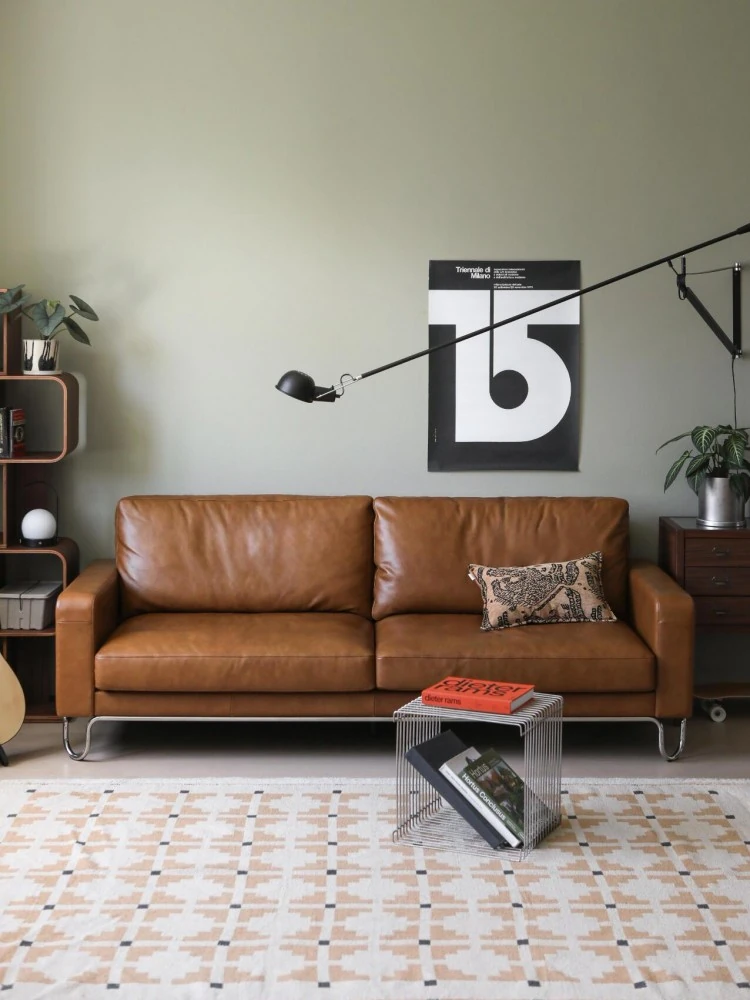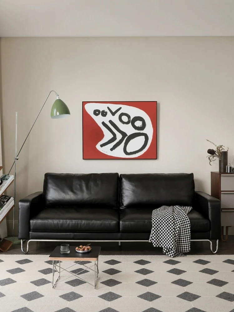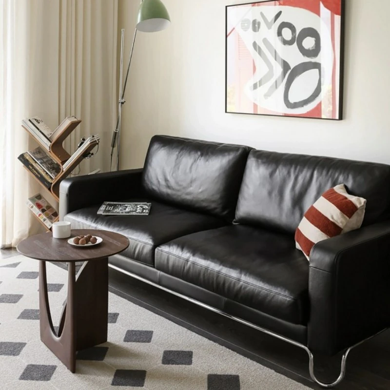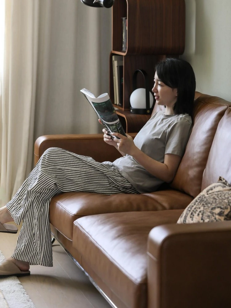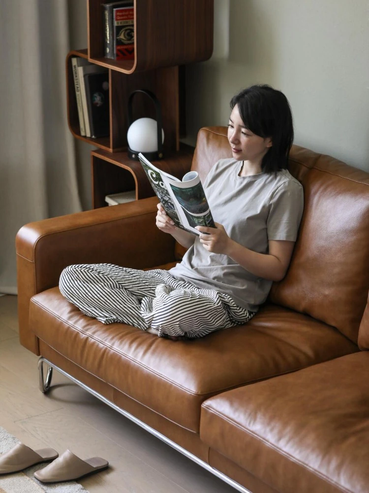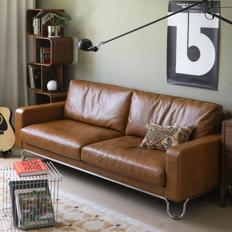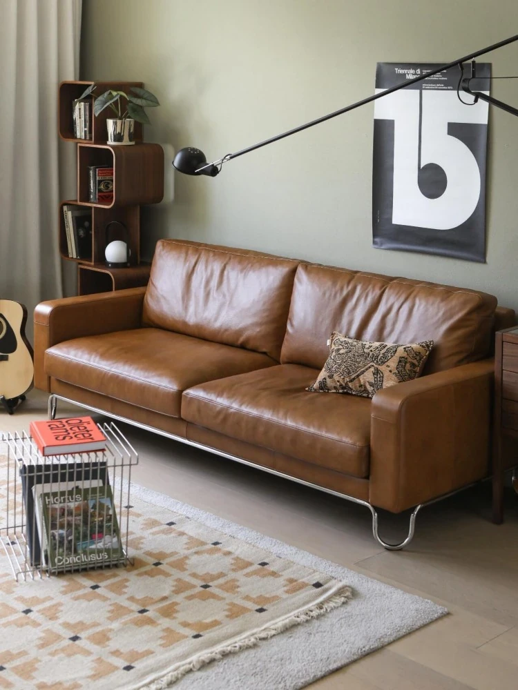 Nordic Minimalist Retro Caramel Genuine Leather Sofa for Small Spaces - Designer All-Leather Mid-Century Style Couch