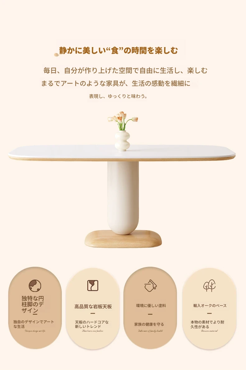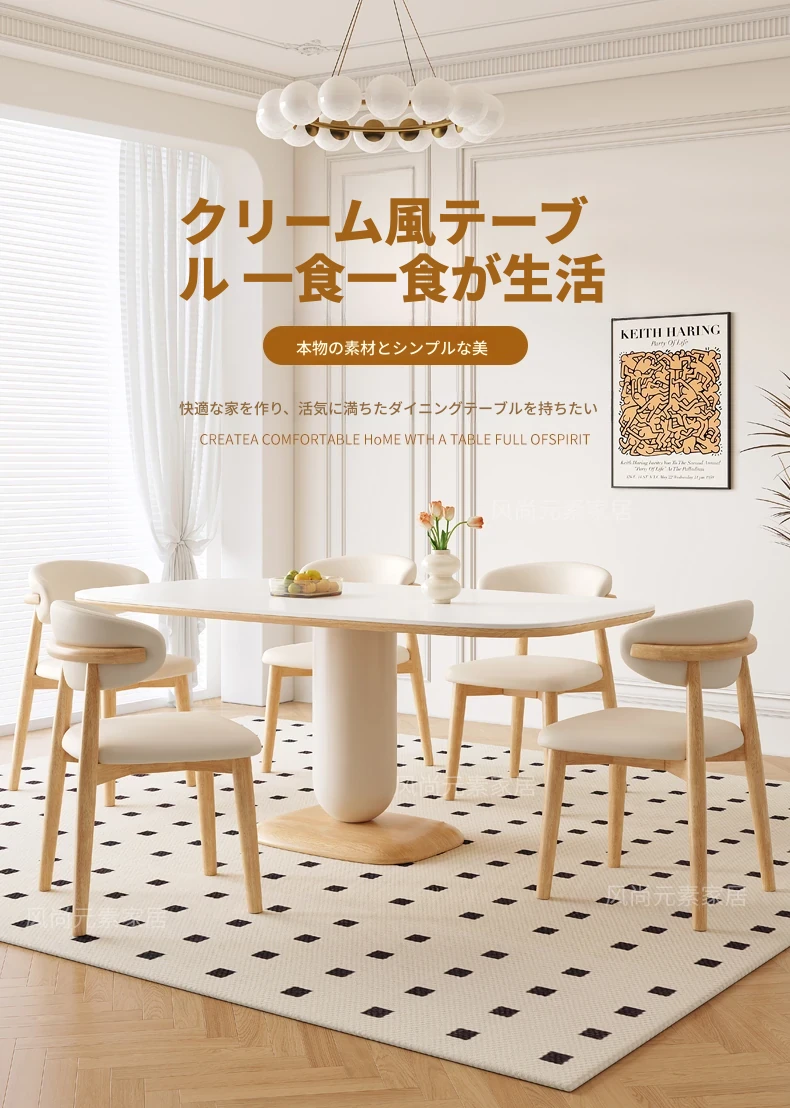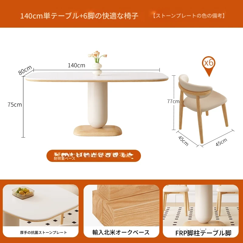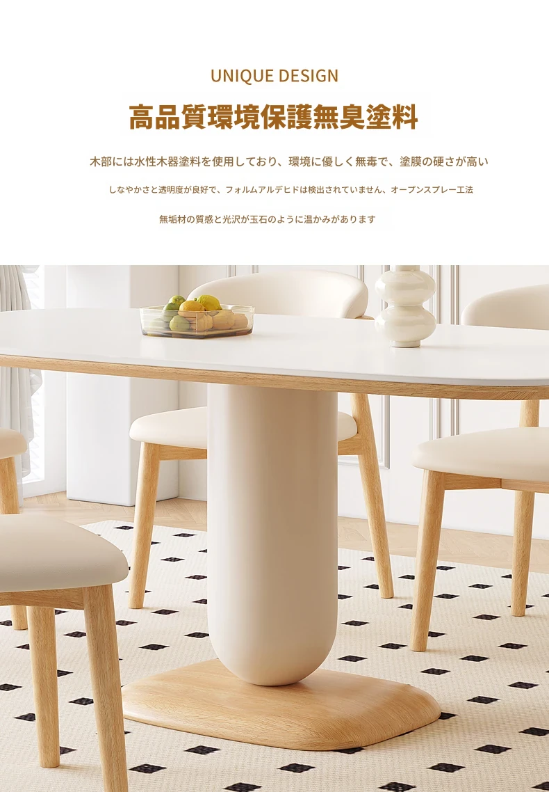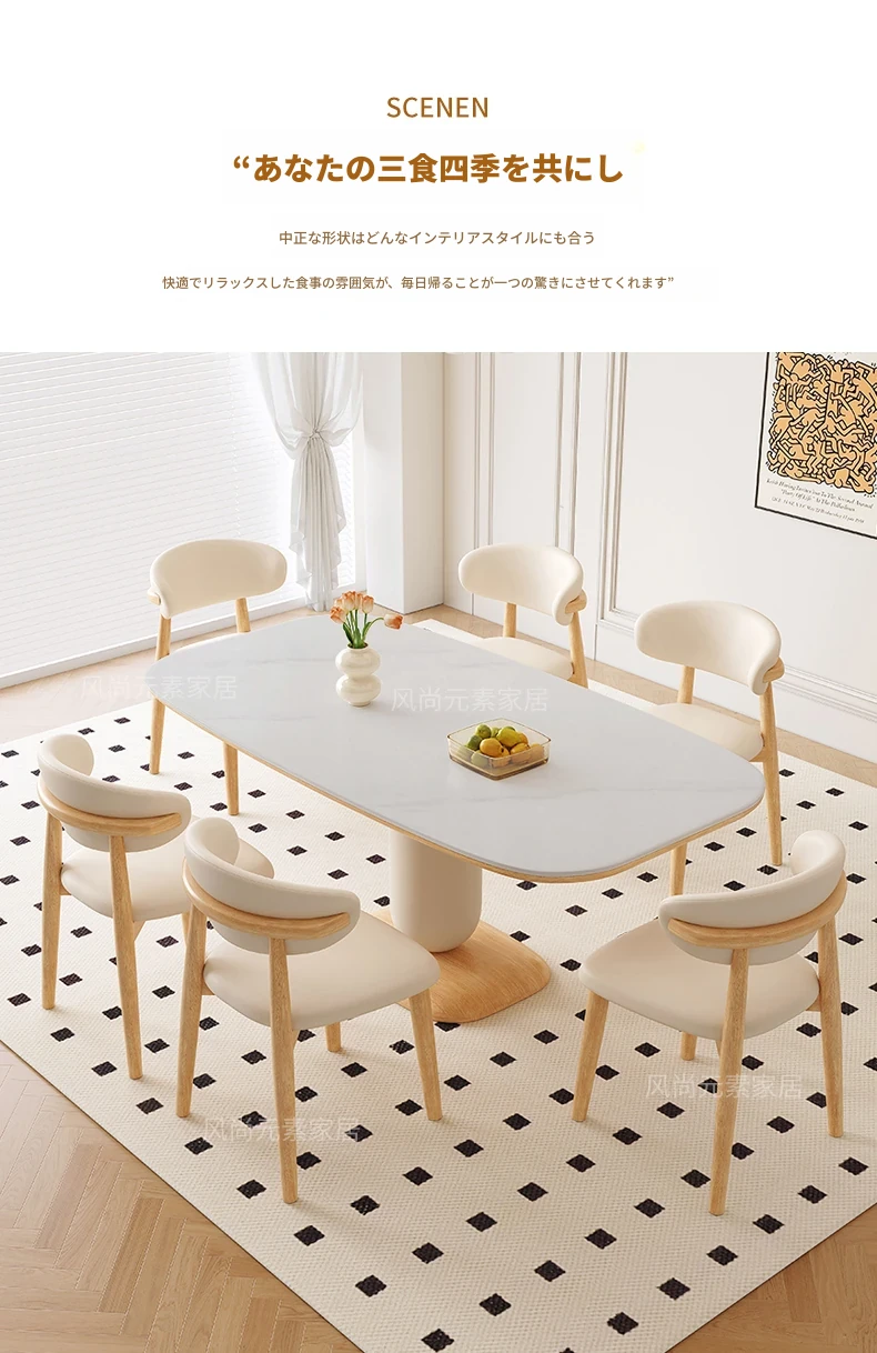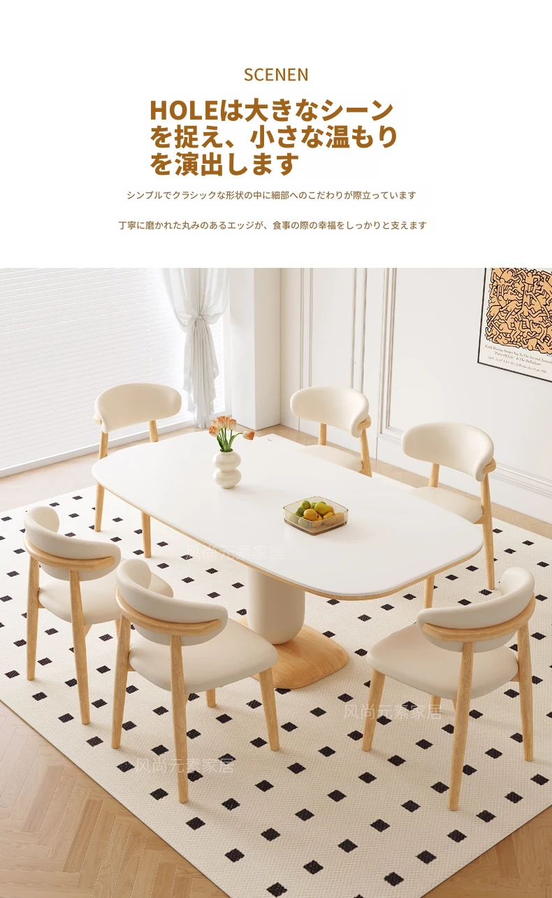 クリーム風の岩板ダイニングテーブル&チェアセット - わびさび風の無垢材使用、北欧スタイルの楕円形デザイン!全実木製で、温かみのある食卓を実現。家庭用にぴったりな、心安らぐ和の雰囲気をお楽しみください。