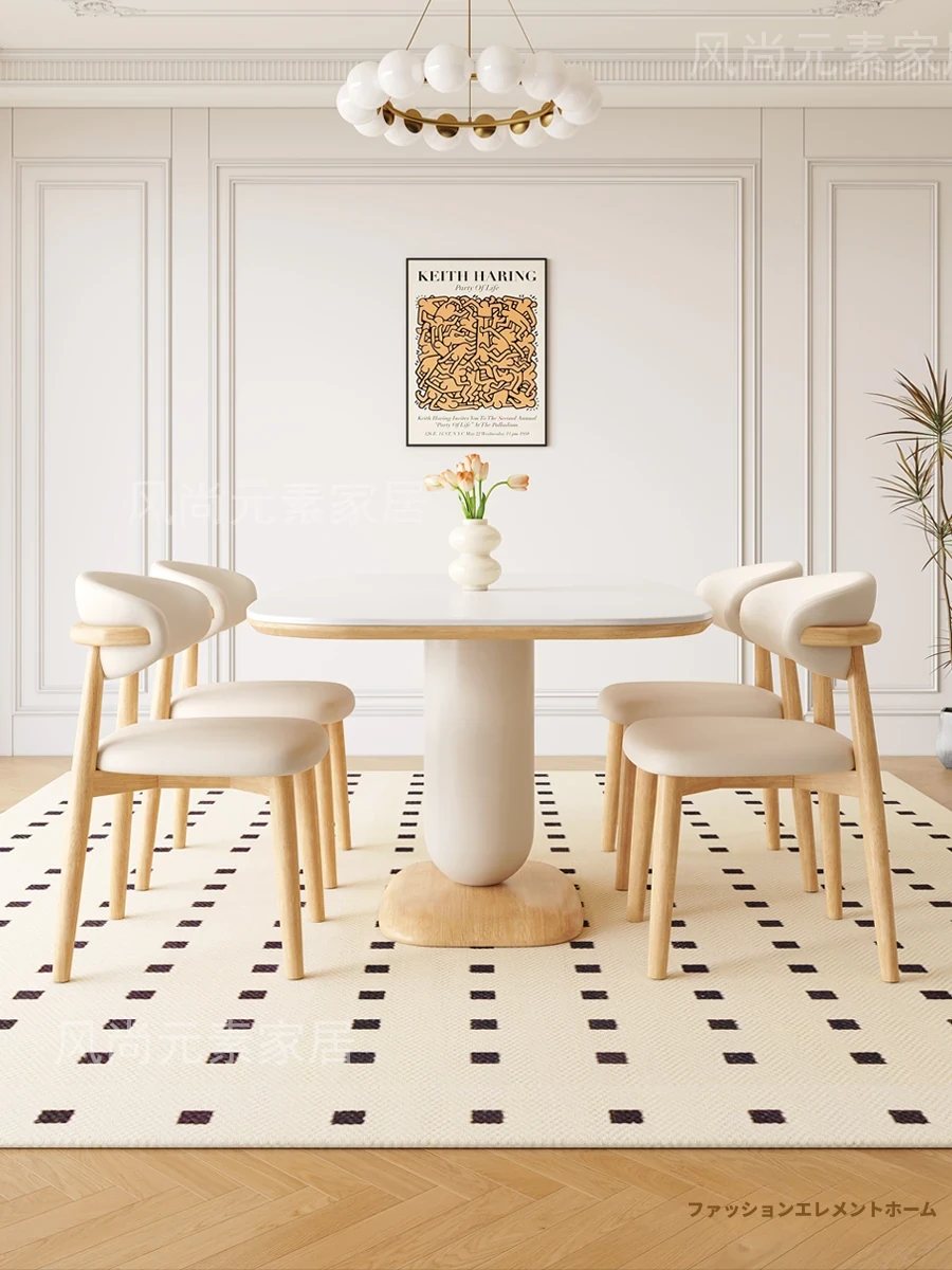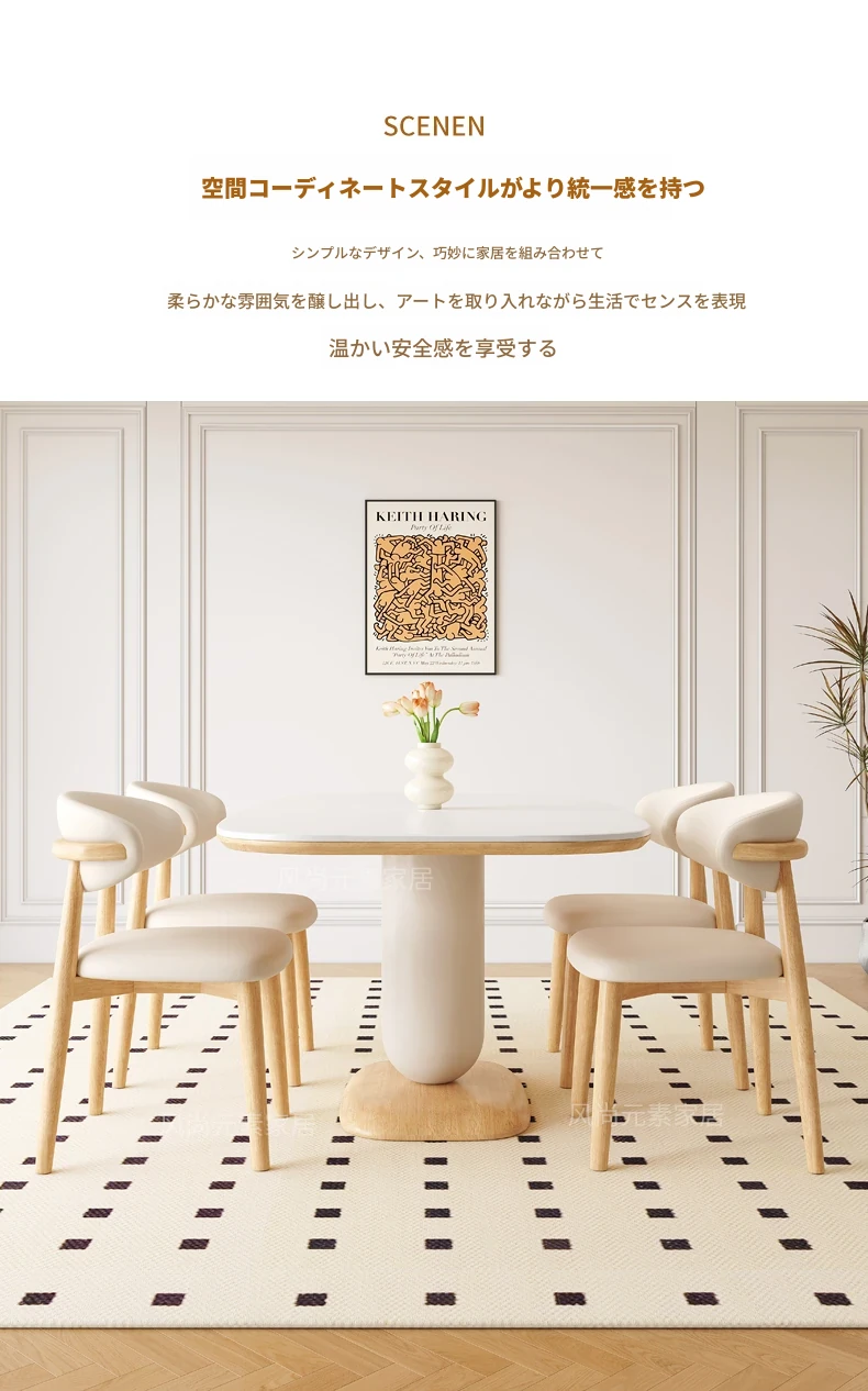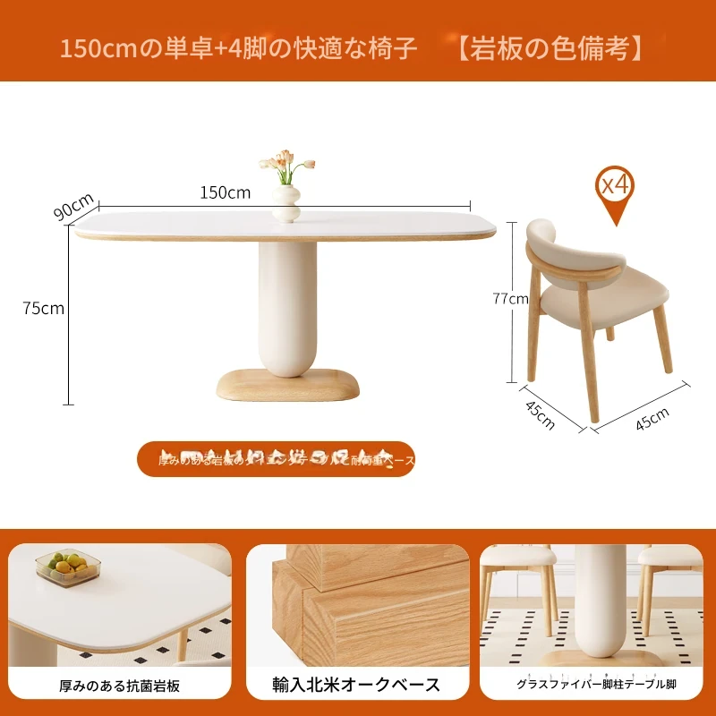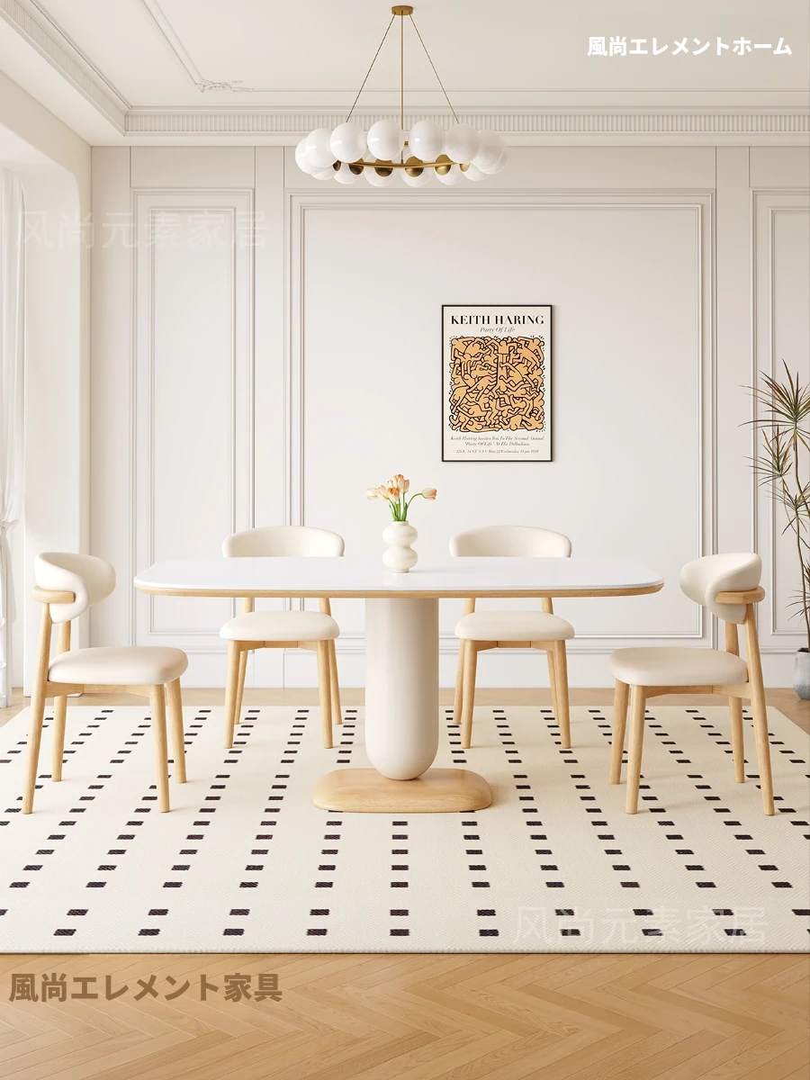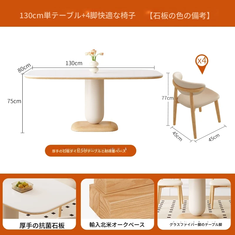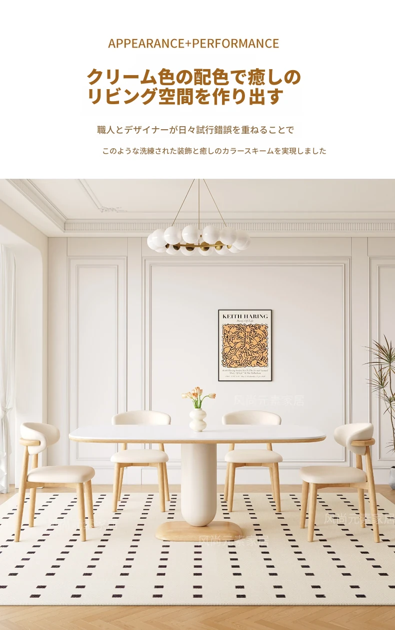 クリーム風の岩板ダイニングテーブル&チェアセット - わびさび風の無垢材使用、北欧スタイルの楕円形デザイン!全実木製で、温かみのある食卓を実現。家庭用にぴったりな、心安らぐ和の雰囲気をお楽しみください。