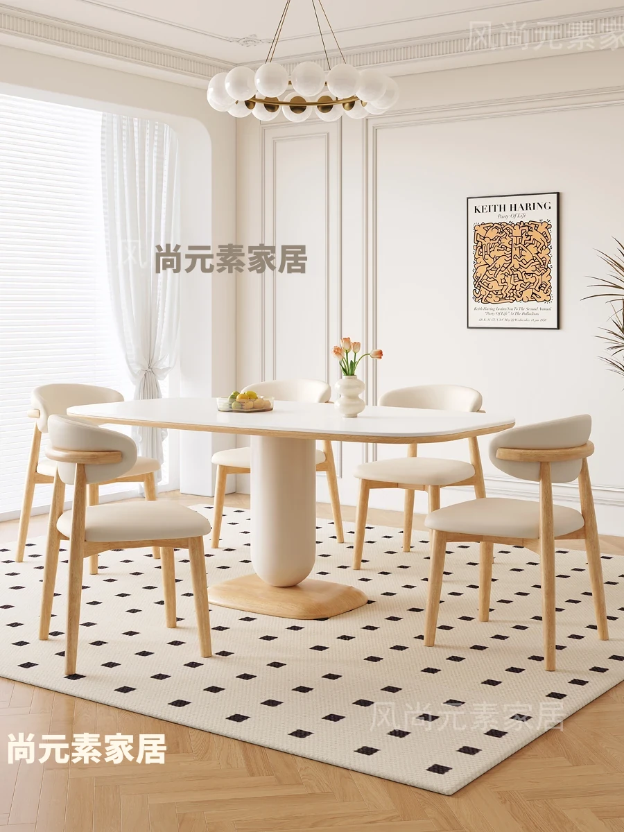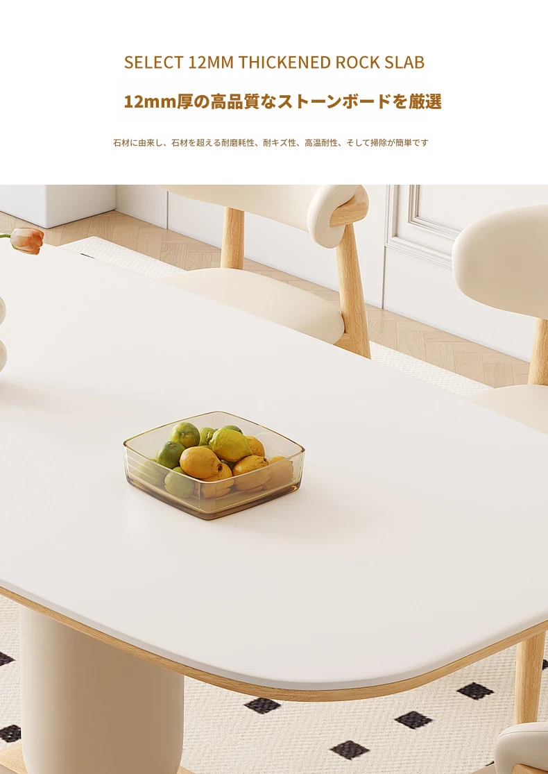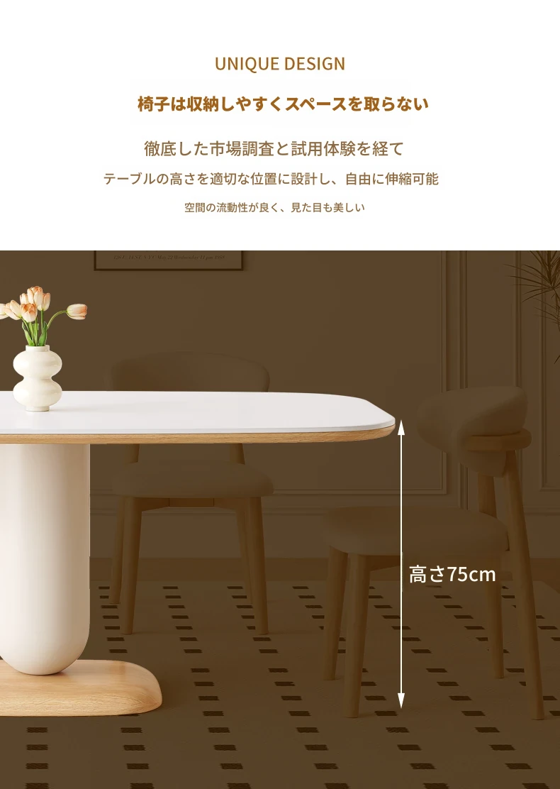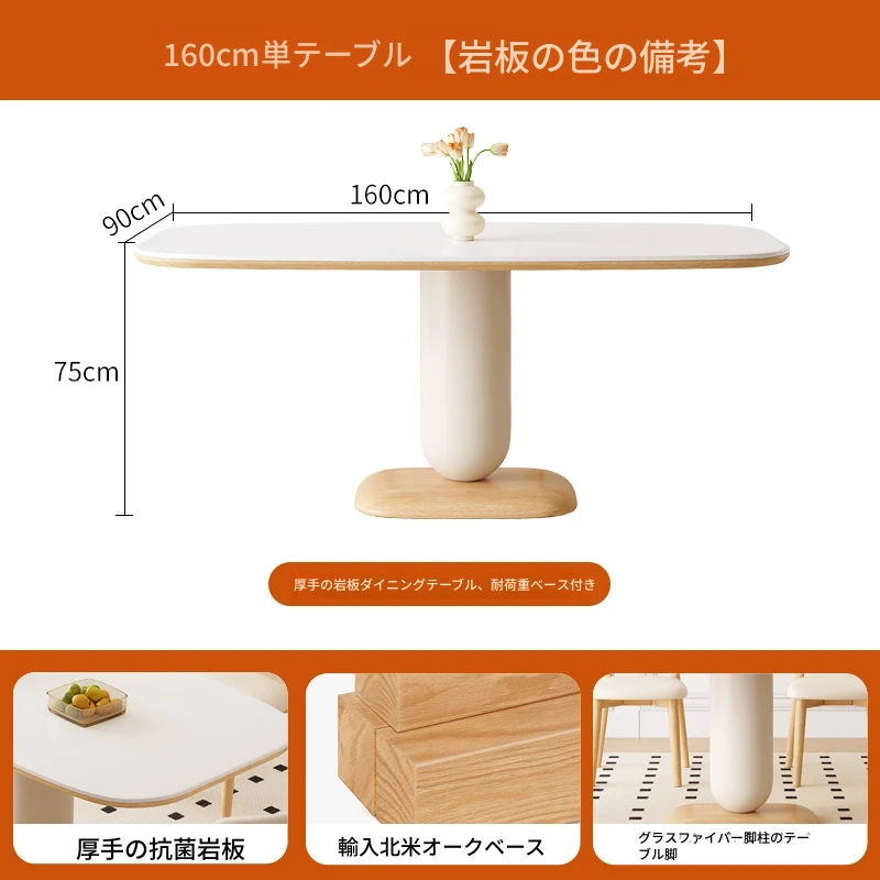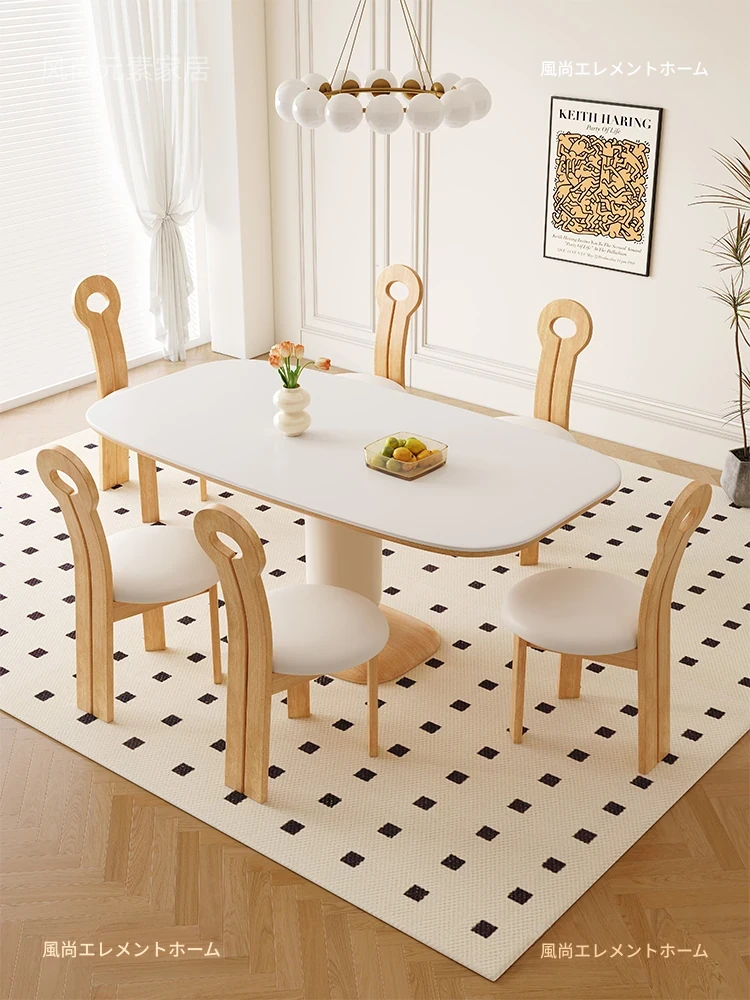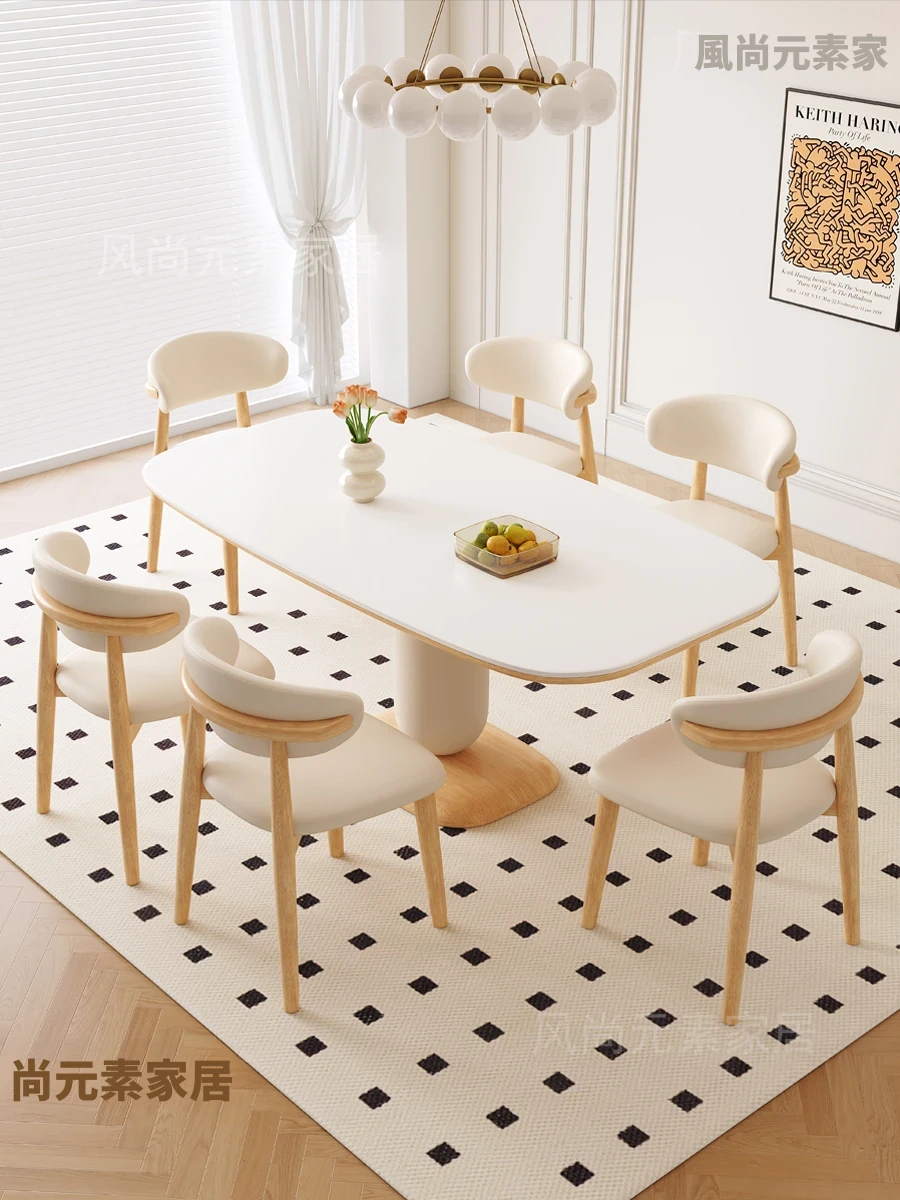 クリーム風の岩板ダイニングテーブル&チェアセット - わびさび風の無垢材使用、北欧スタイルの楕円形デザイン!全実木製で、温かみのある食卓を実現。家庭用にぴったりな、心安らぐ和の雰囲気をお楽しみください。