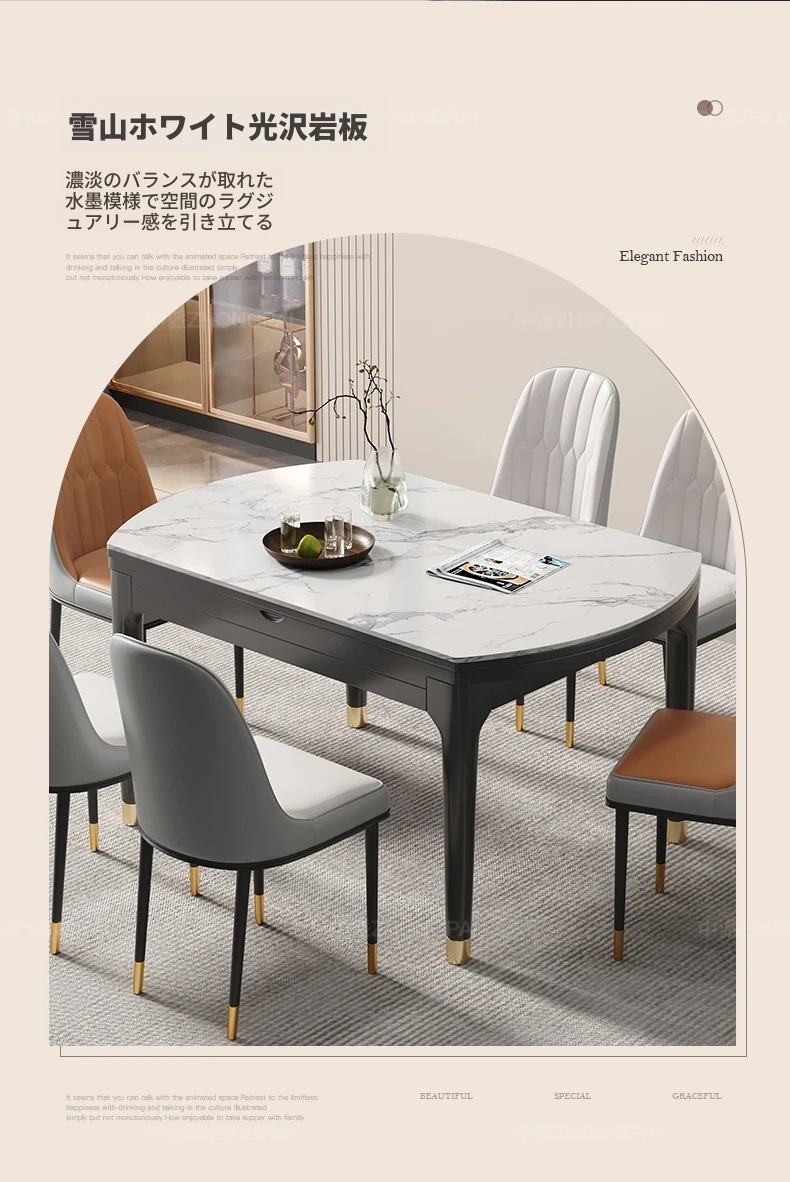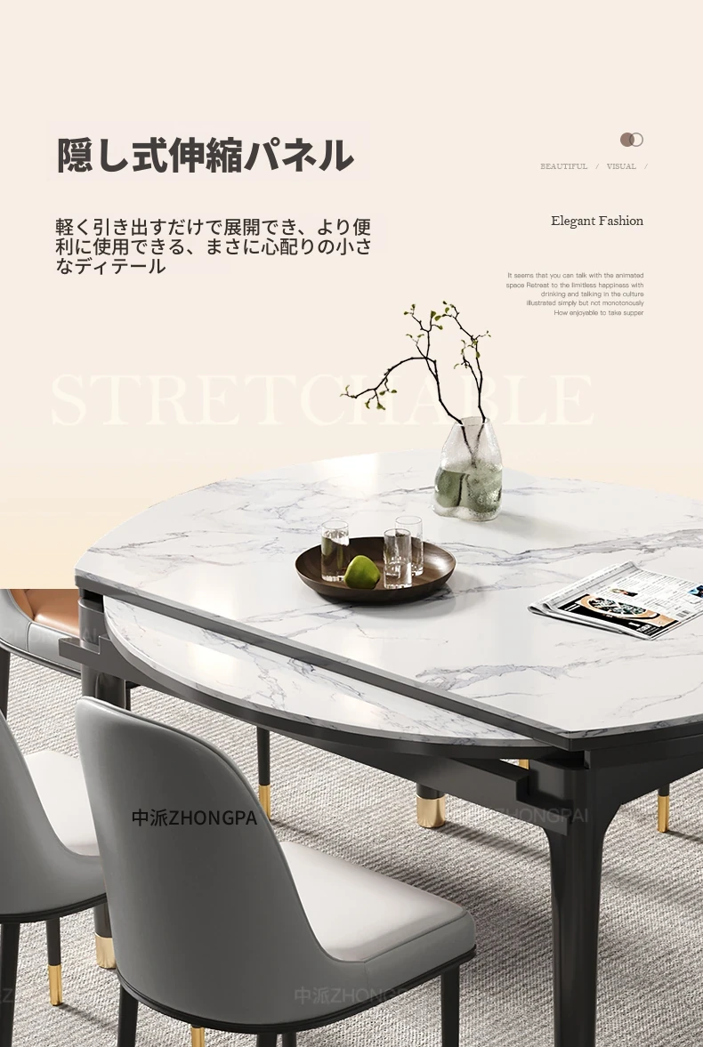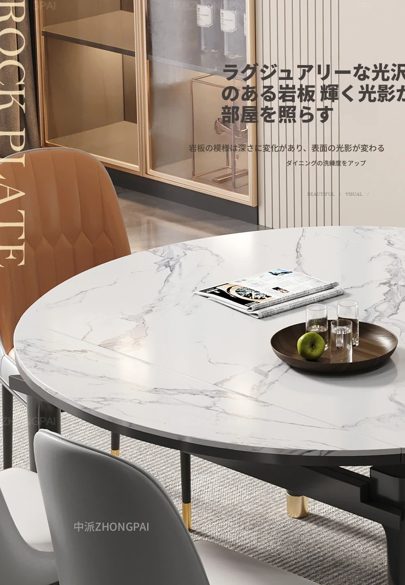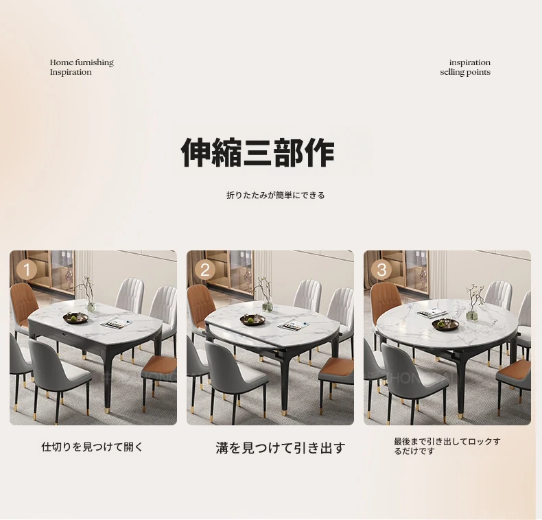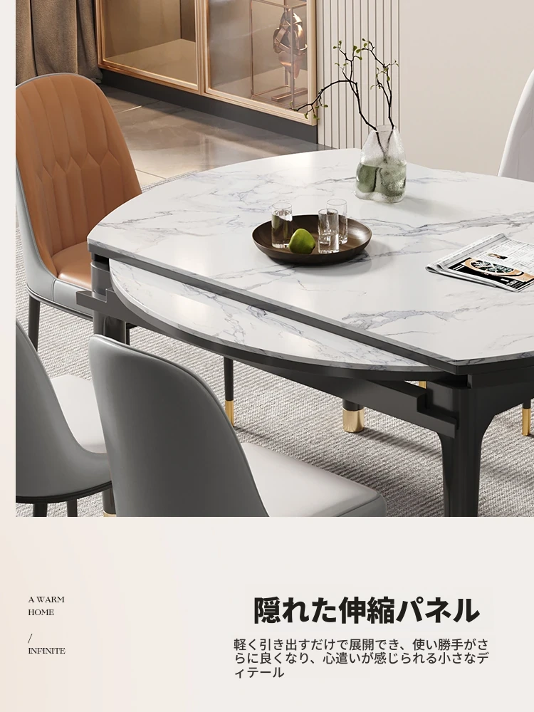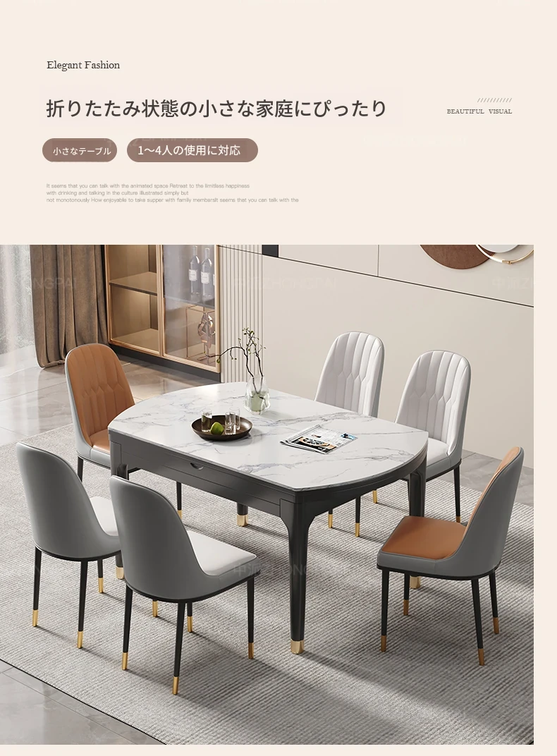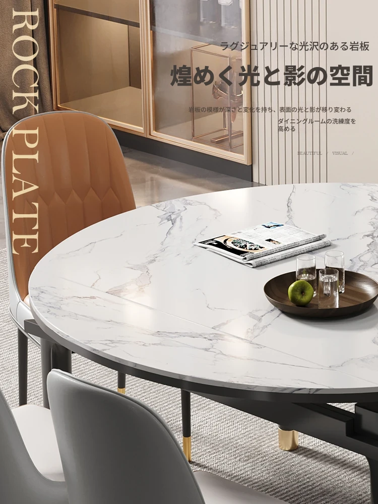 2023年新作!軽やかに変形できるラグジュアリーな無垢材ロックボードダイニングテーブルセット。北欧スタイルの伸縮式折りたたみテーブルと椅子のコンビネーションで、家族や友人との素敵な食卓を演出します!