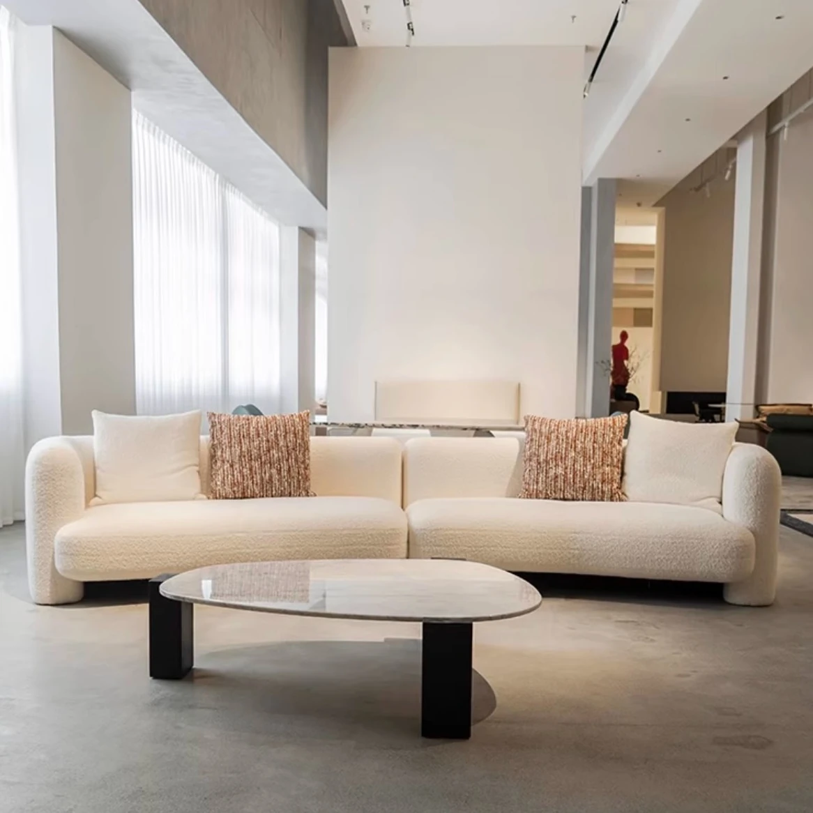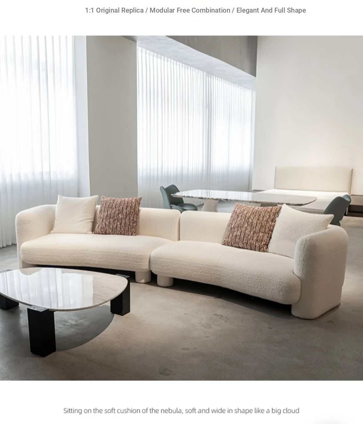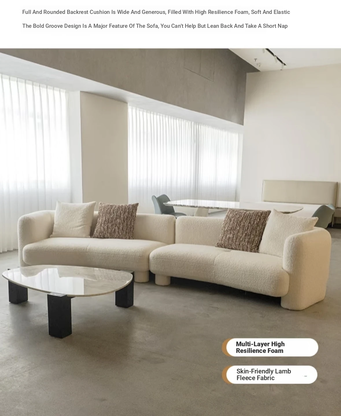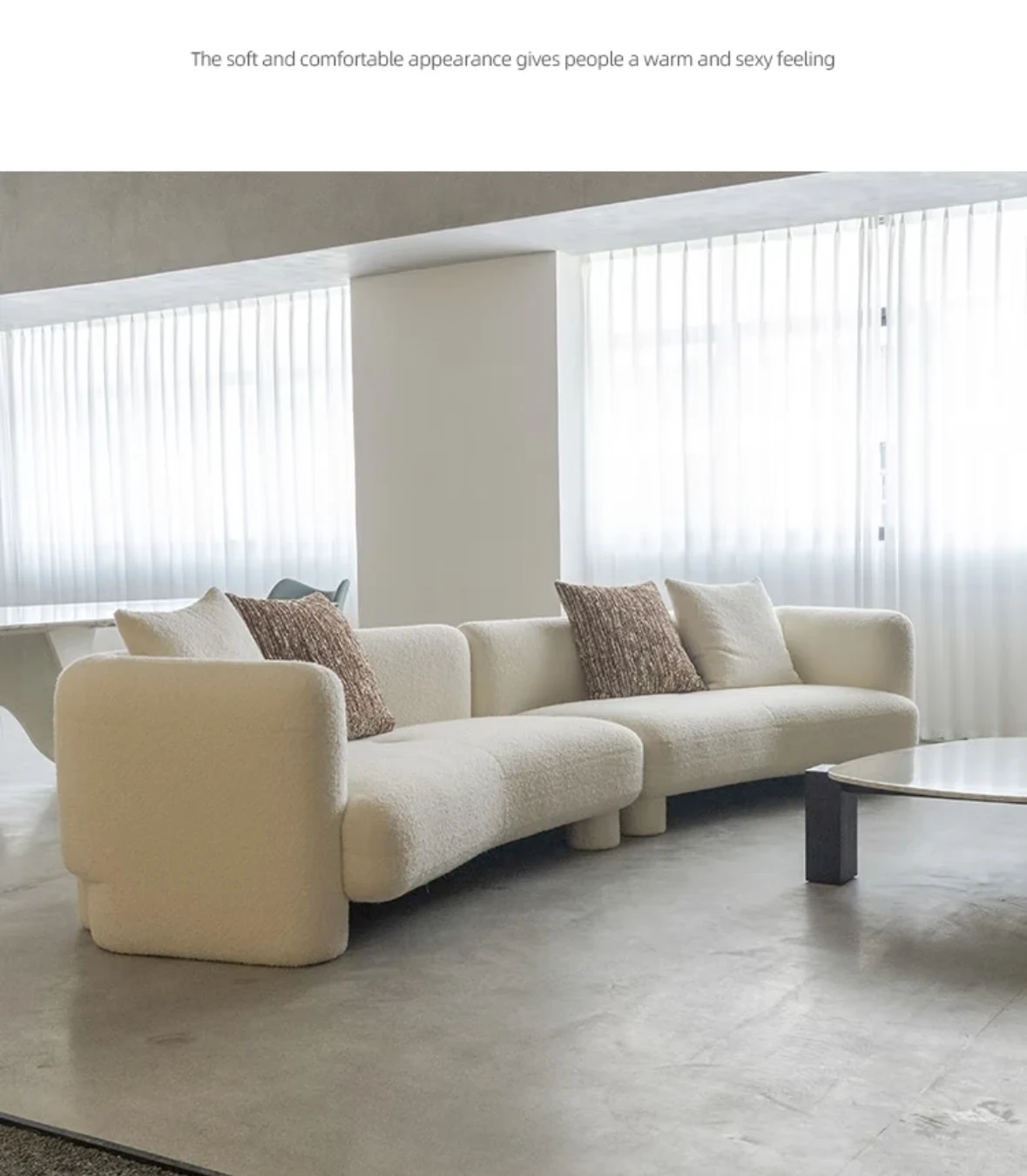 French Vintage Cream Curved Sofa – Unique Irregular Design for Designer Living Rooms, Perfect for Small and Large Spaces, Featuring Cozy Lambskin Fabric