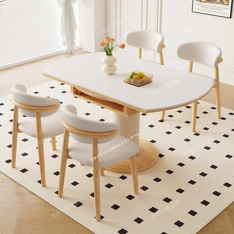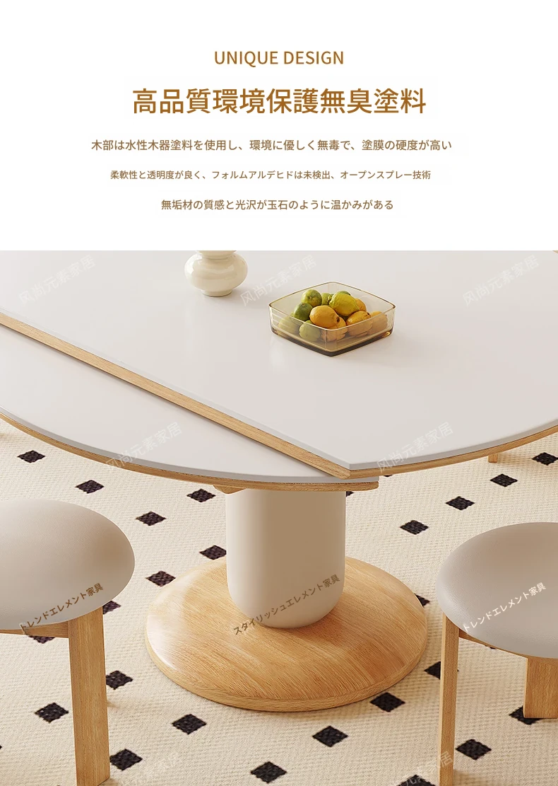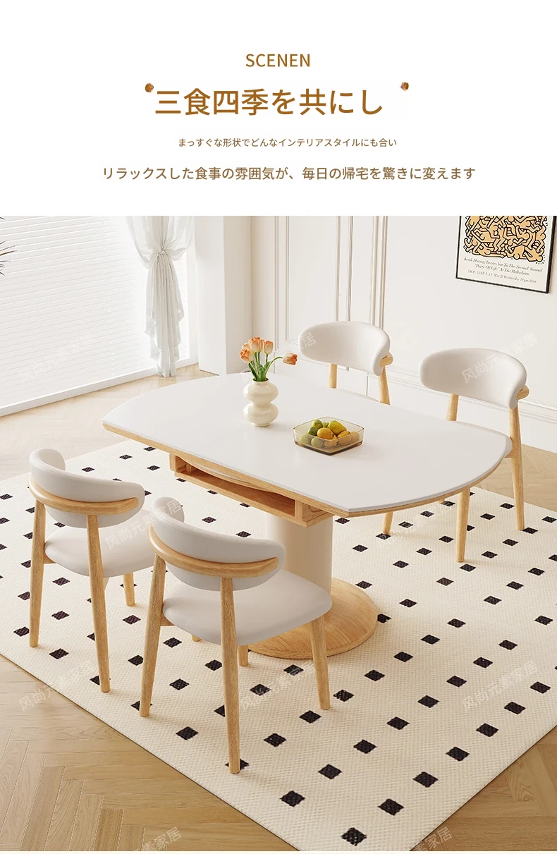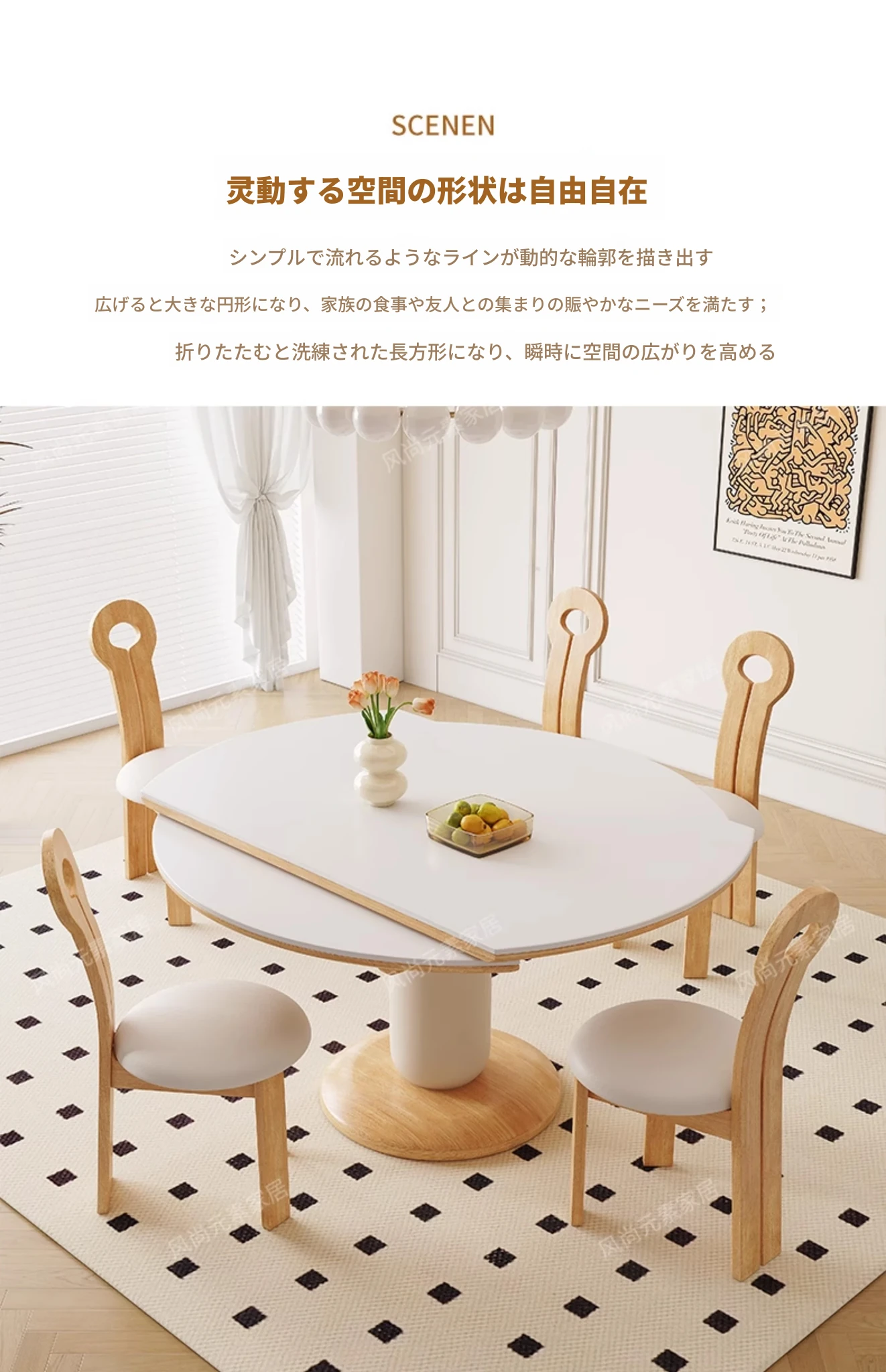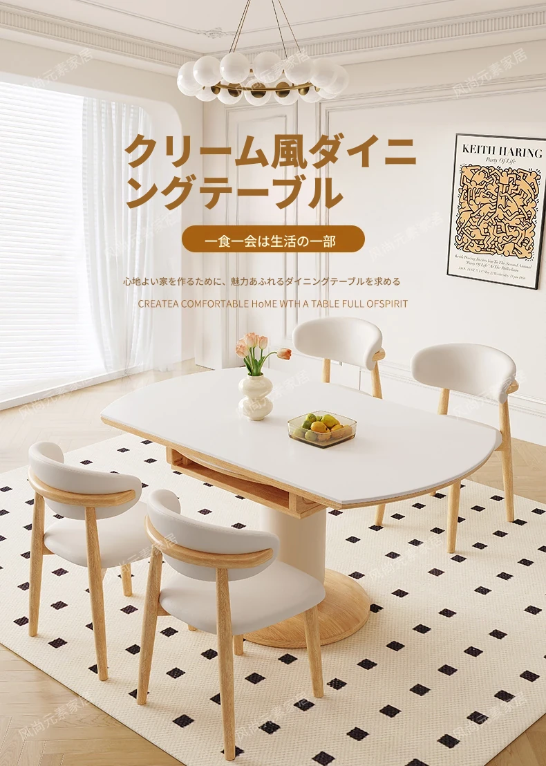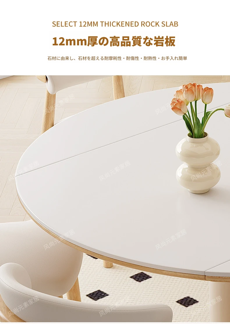 クリーム風デザインの岩板ダイニングテーブル&チェアセット|北欧モダンスタイル|四角と丸の二役をこなす伸縮可能な家庭用食卓|小さなスペースにも最適!