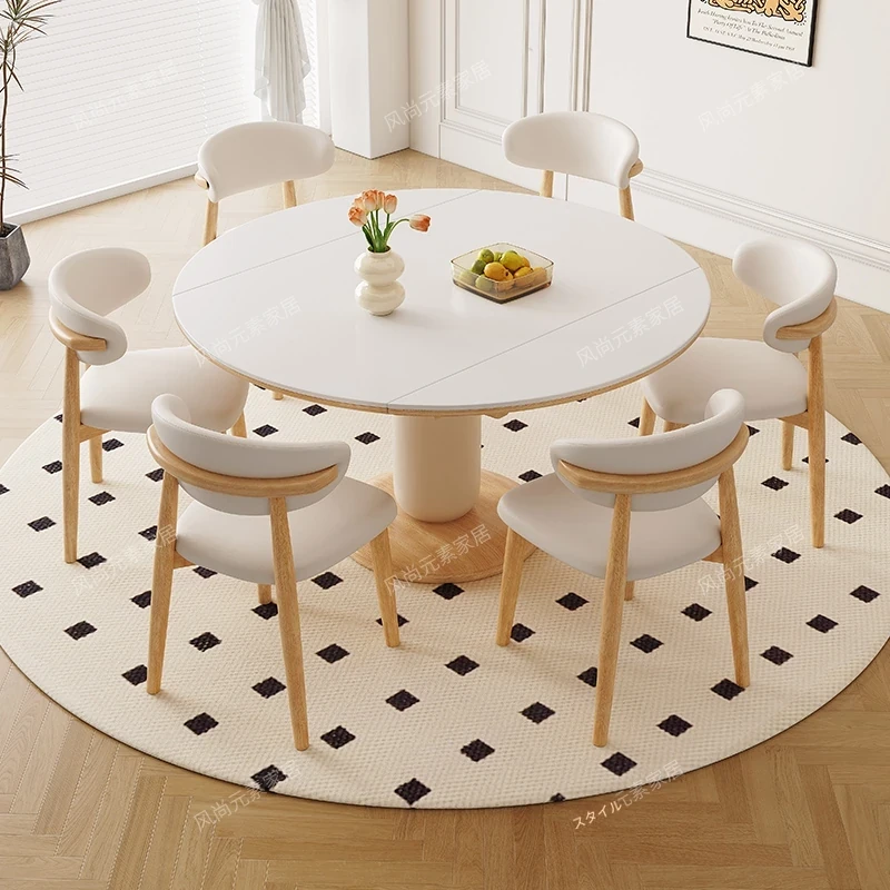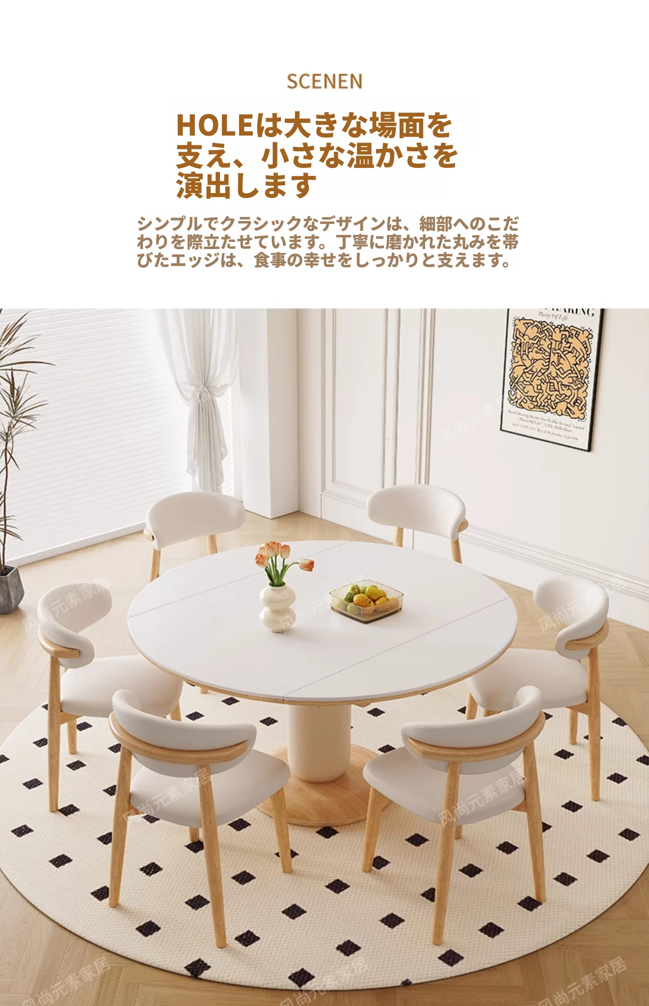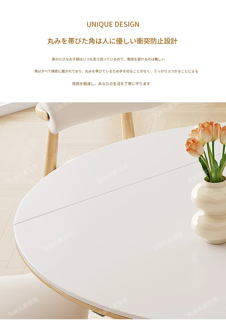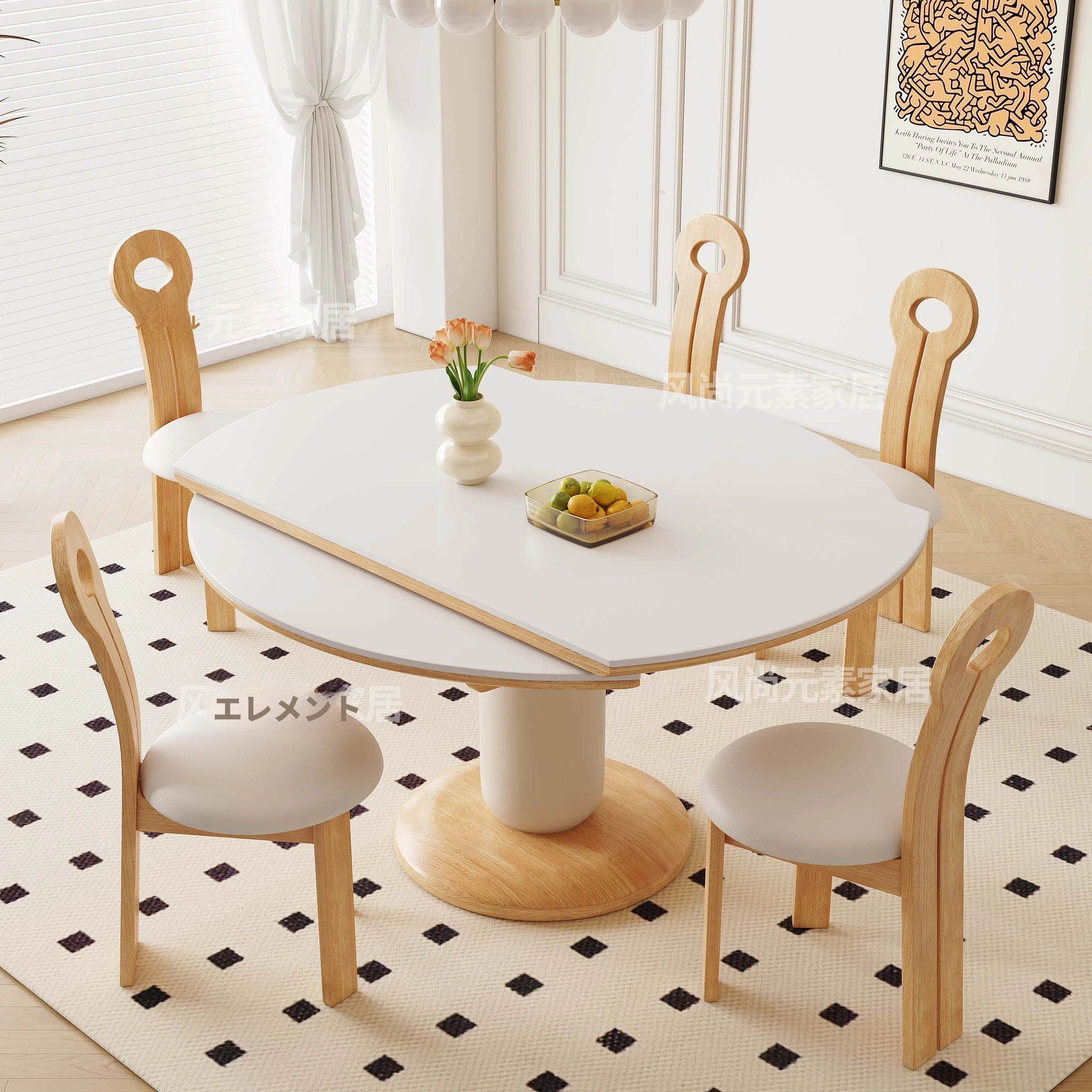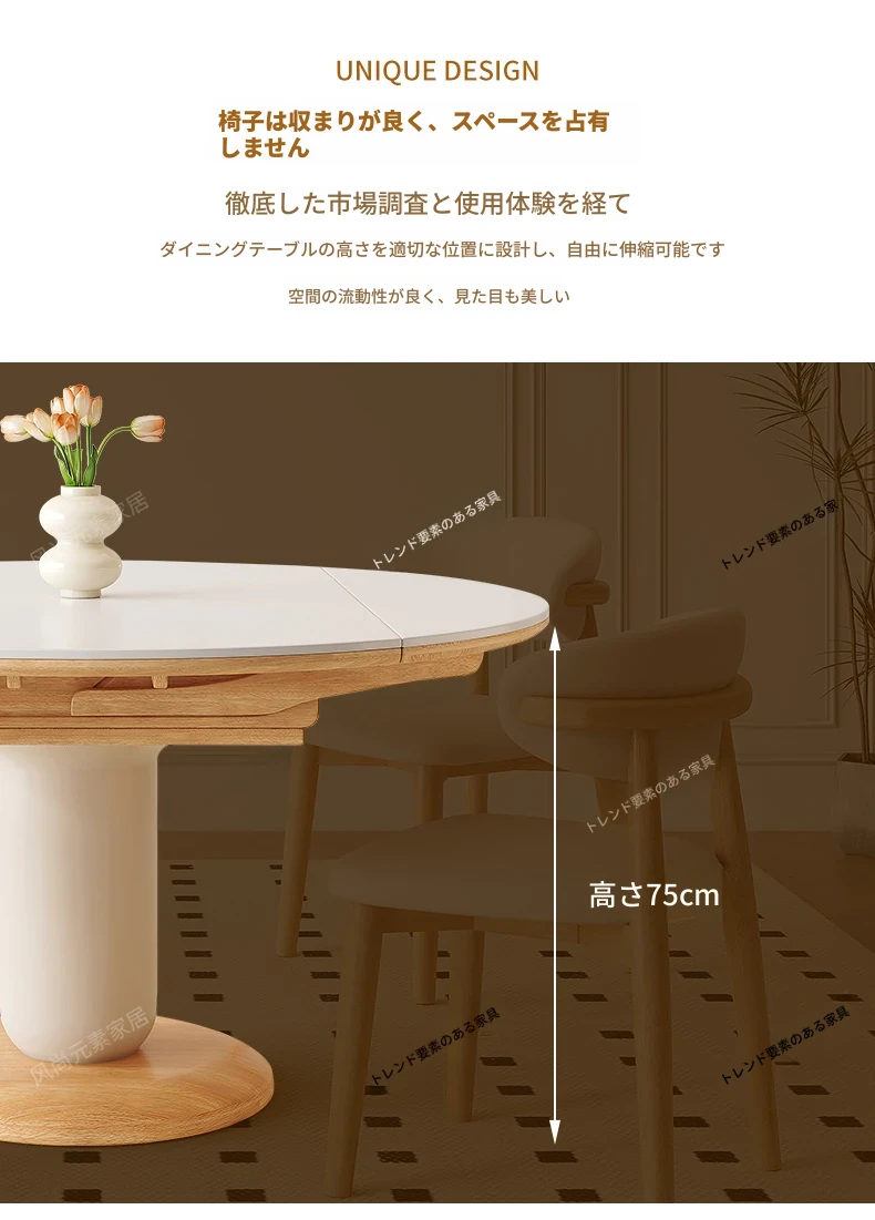 クリーム風デザインの岩板ダイニングテーブル&チェアセット|北欧モダンスタイル|四角と丸の二役をこなす伸縮可能な家庭用食卓|小さなスペースにも最適!