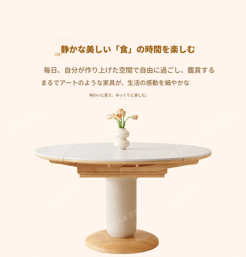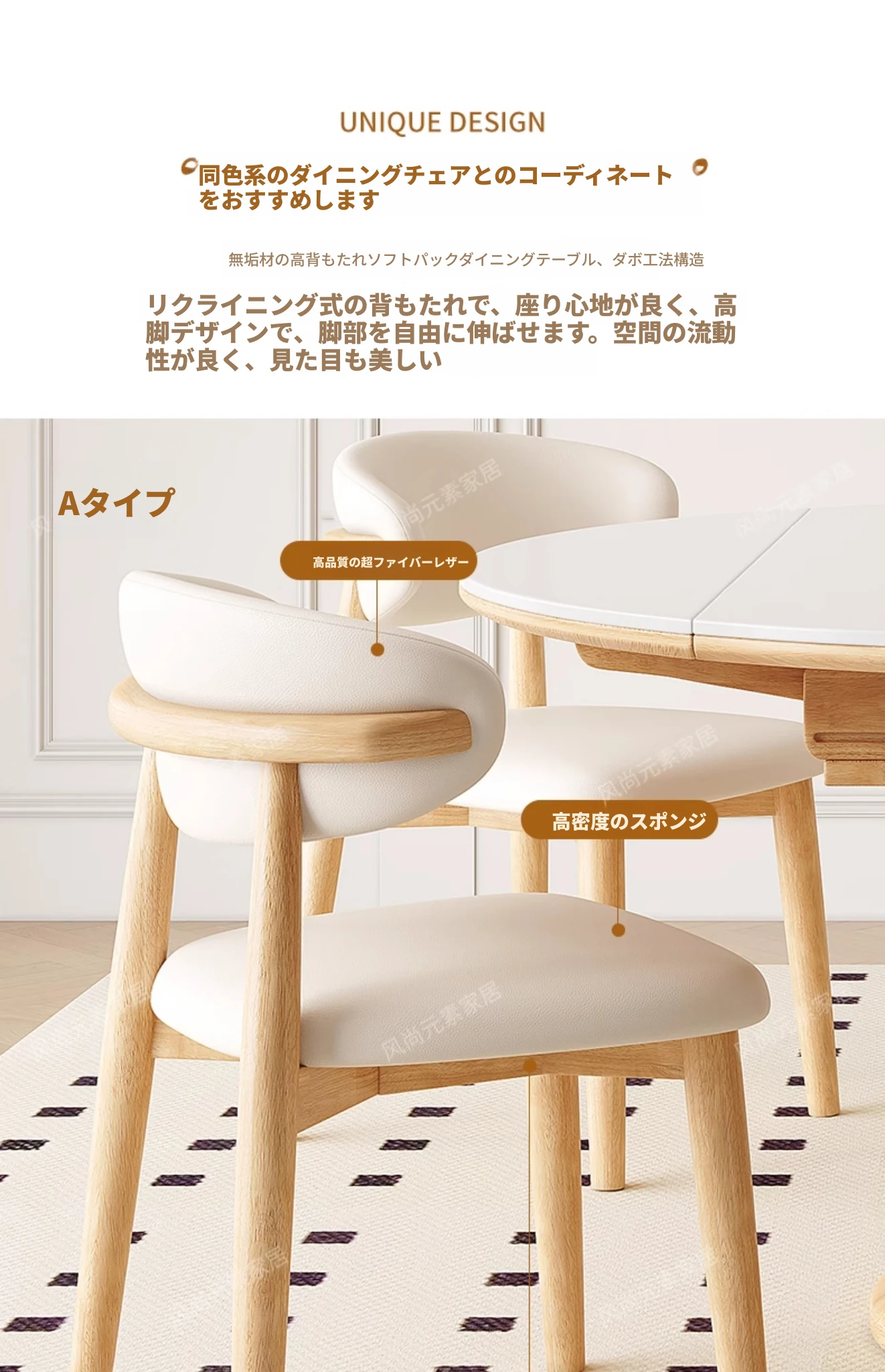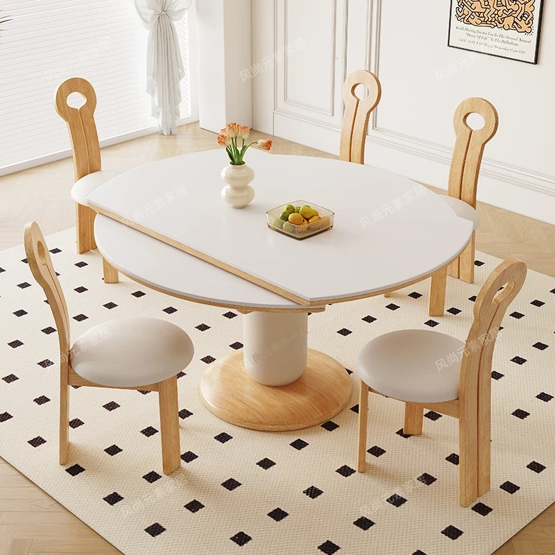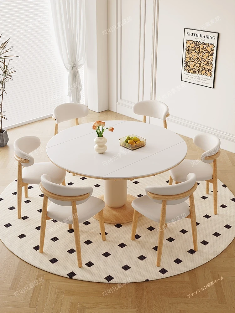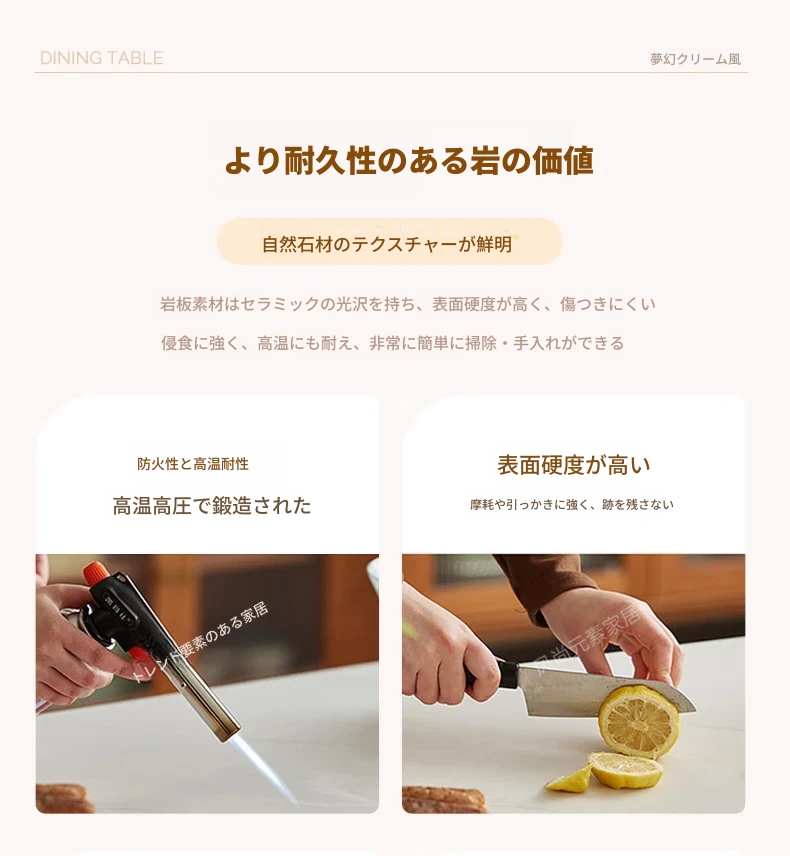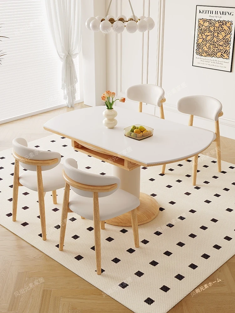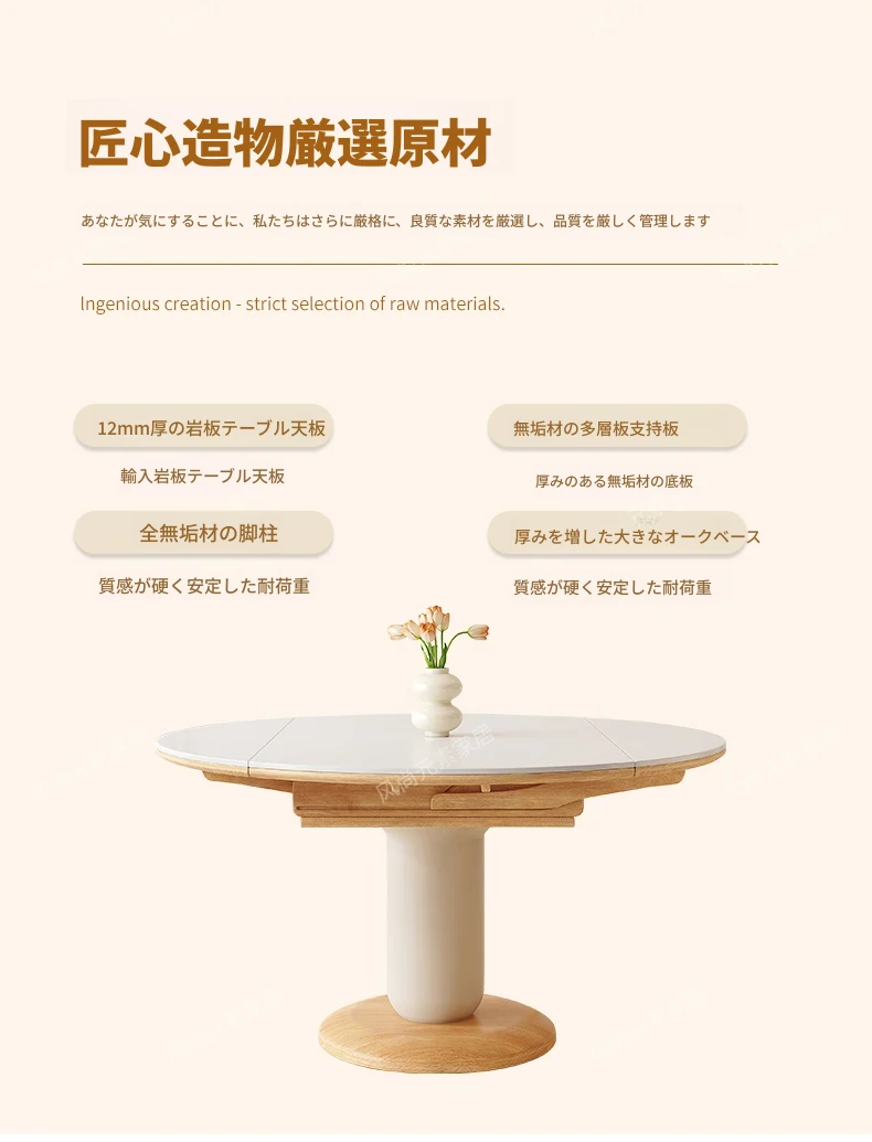 クリーム風デザインの岩板ダイニングテーブル&チェアセット|北欧モダンスタイル|四角と丸の二役をこなす伸縮可能な家庭用食卓|小さなスペースにも最適!