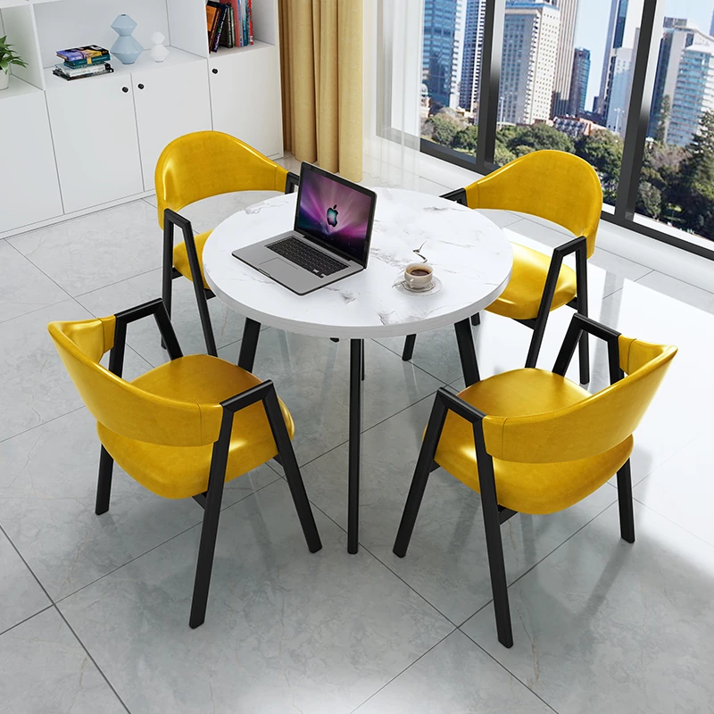 黄色の革椅子80*80&模石白模様のテーブル1+4