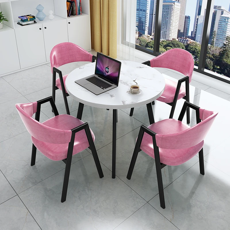 ピンクの革椅子80*80&模石白模様のテーブル1+4