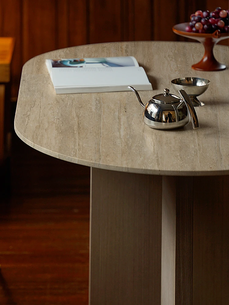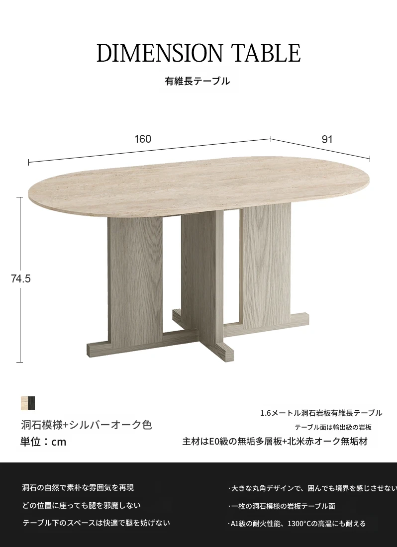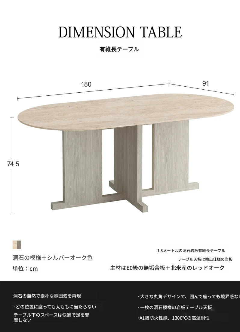 有维ダイニングテーブル洞石板(洞石模様ランダム)+シルバーオーク色脚(1.8m)