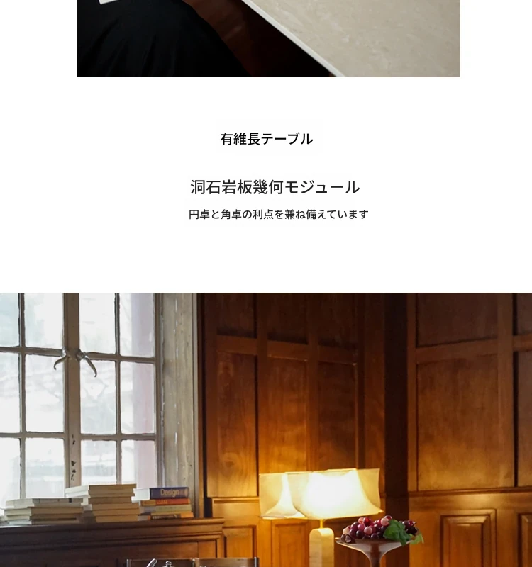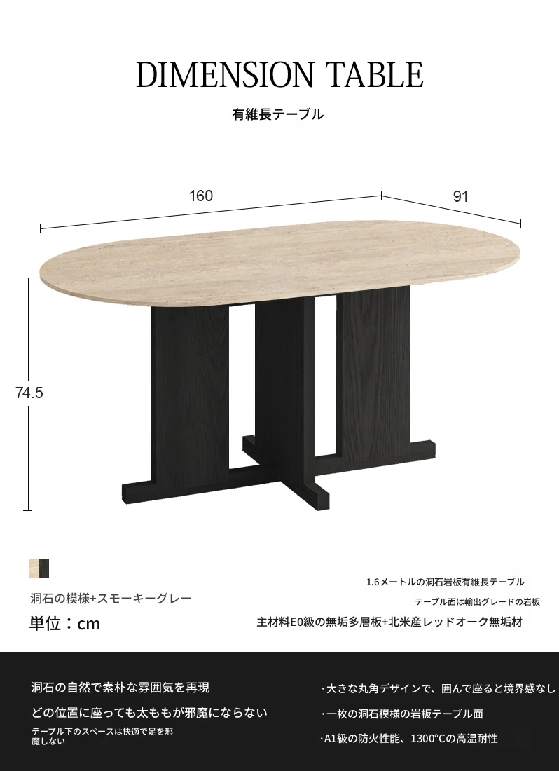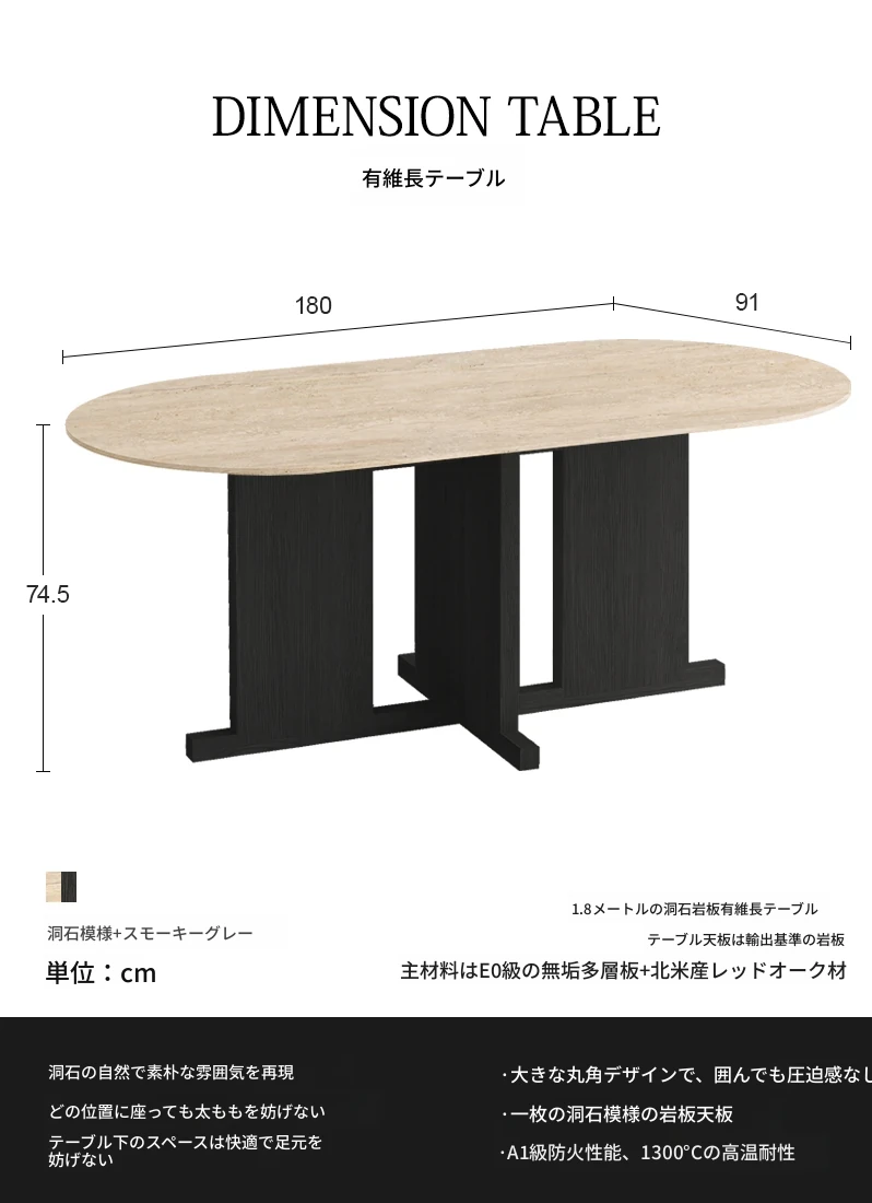 有维ダイニングテーブル洞石板(洞石模様ランダム)+スモークブラック色脚(1.8m)