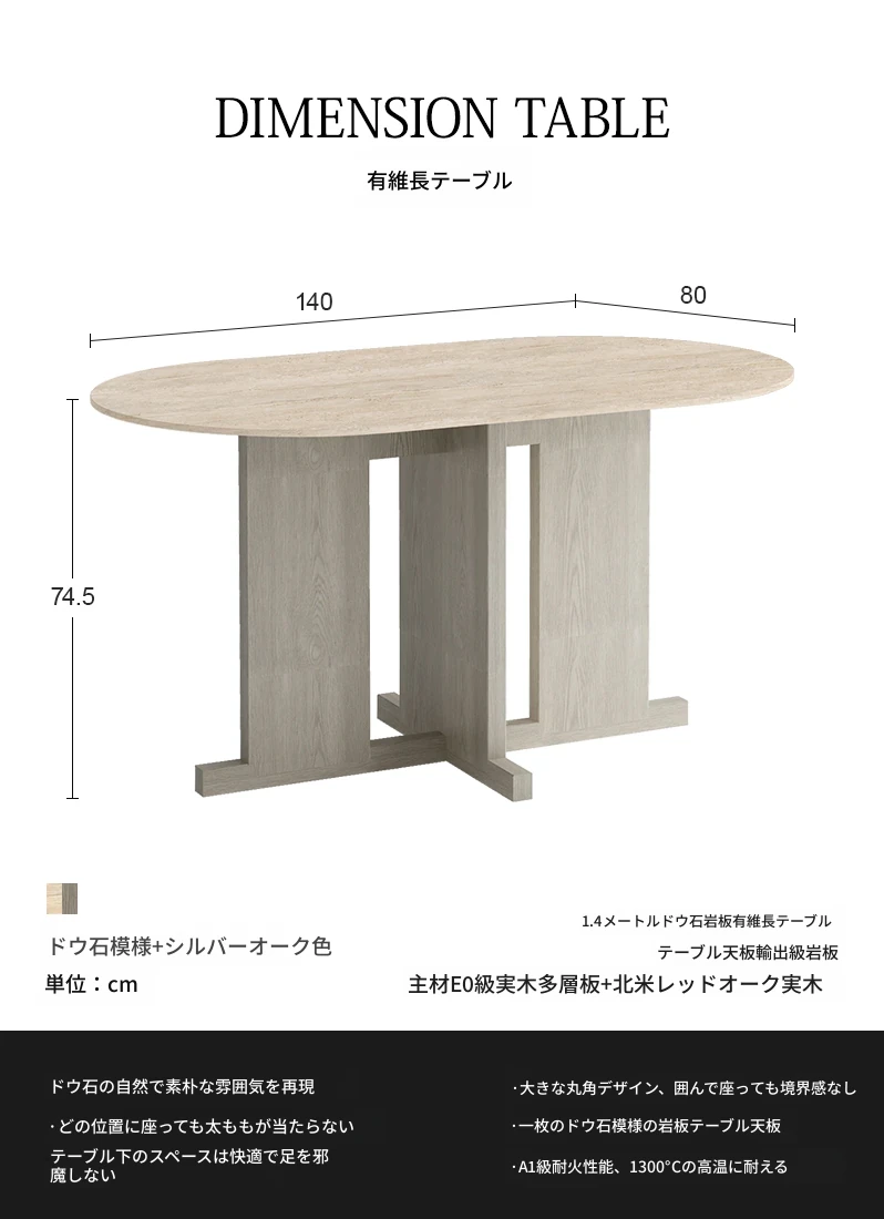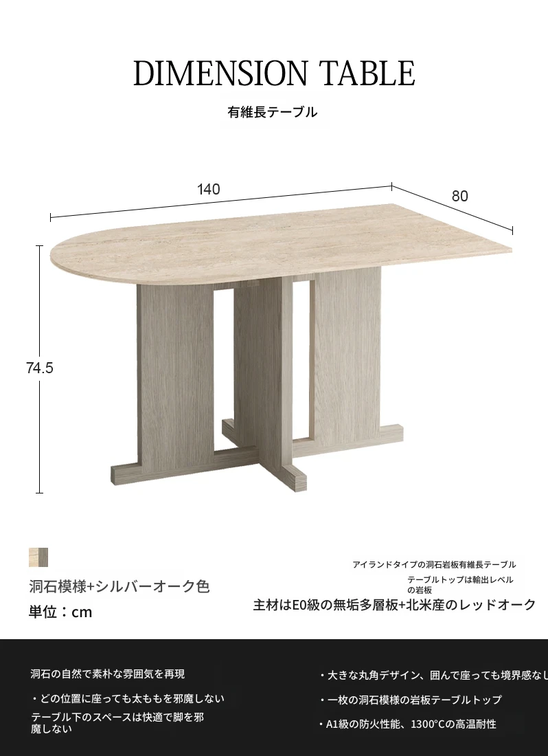 有维ダイニングテーブル洞石板(洞石模様ランダム)+シルバーオーク色脚(1.4m)