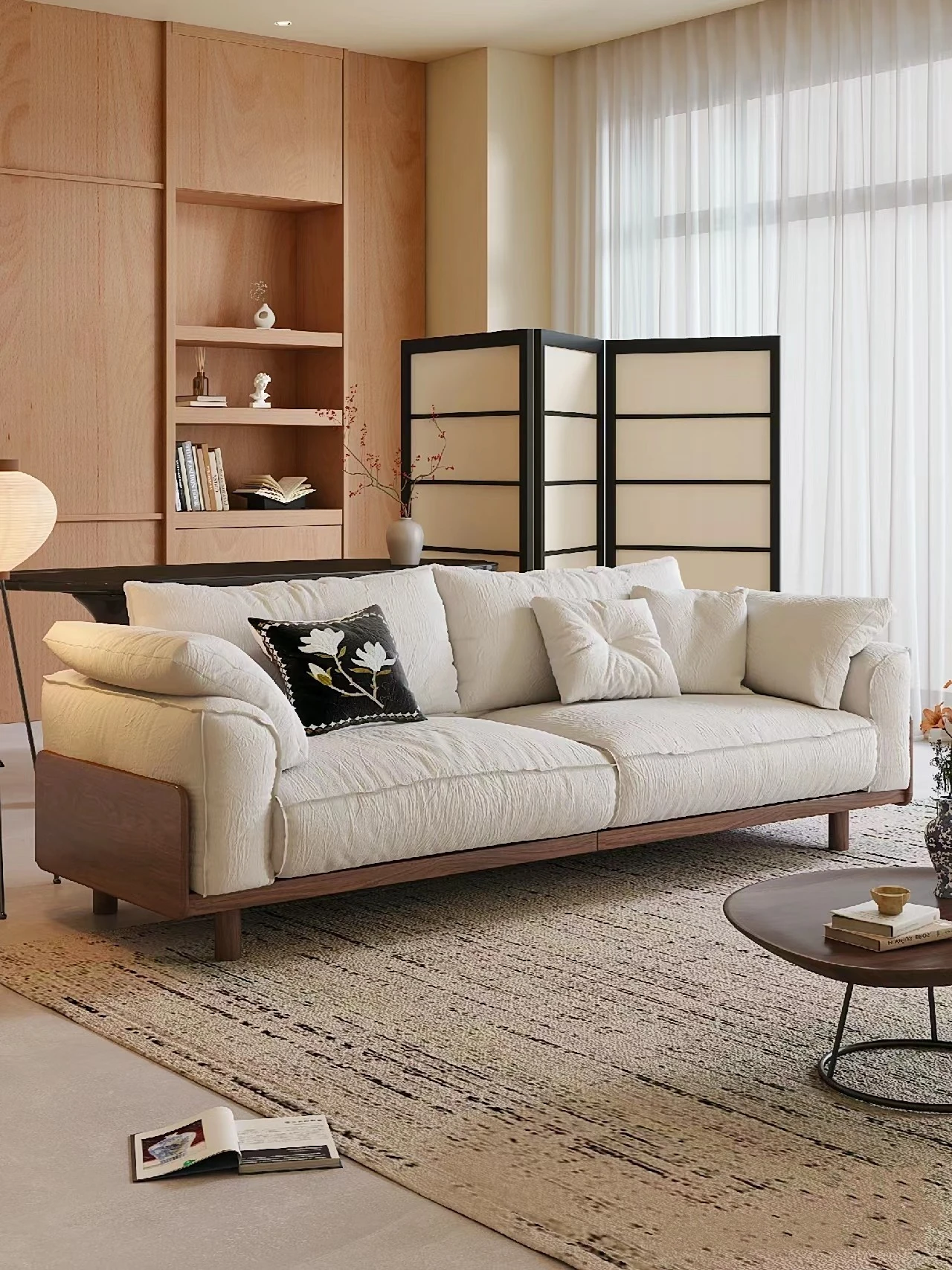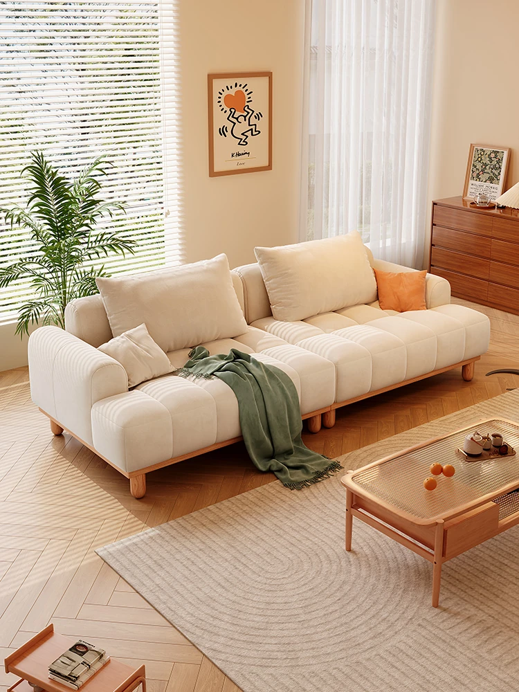 2025年新作!贅沢なクリーム風ベビーフランネルソファ - モダンなデザイン、ハイスタンドホワイトアッシュ無垢材、心地よいファブリックでリビングを華やかに演出!