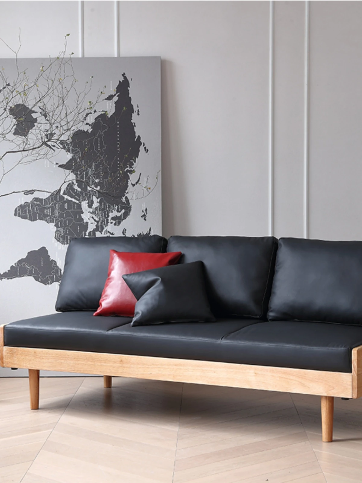 直感的贅沢、イタリアンスタイルのミニマルデザイン!アームレスでレトロなウォールナット材の3人掛けレザーソファ。ブラックカラーが洗練された雰囲気を演出し、リビングやオフィスに最適です。